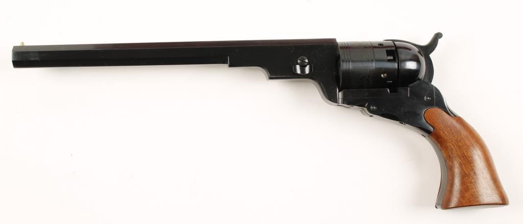 Replica black powder single action 6-shot percussion pistol. Blued 9" octagon barrel with "Texas Paterson Cal. .36" on the top. No loading lever. Blued and roll-stamped cylinder showing a stage coach hold-up. Blued frame and backstrap. Folding trigger. Factory shipping box. Condition is like new in box. *Antique Firearm*