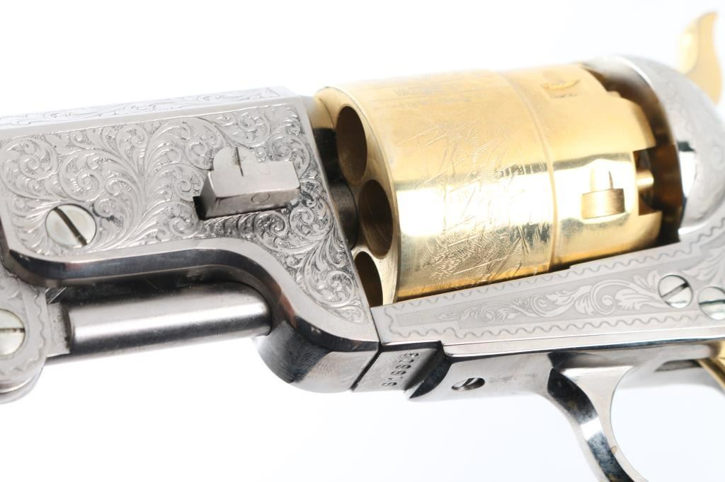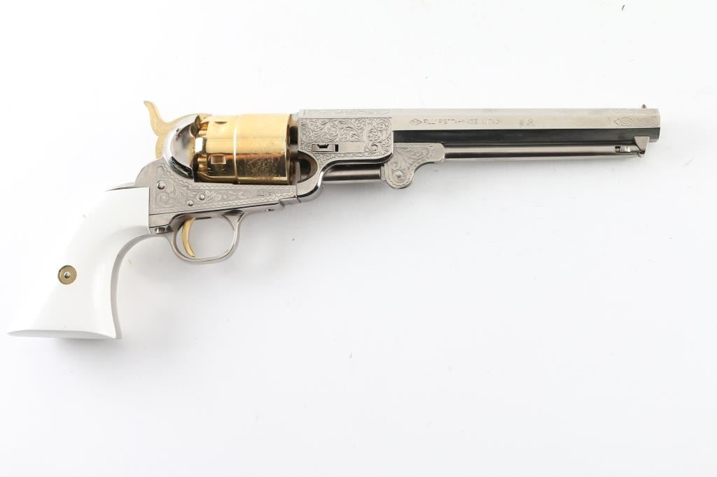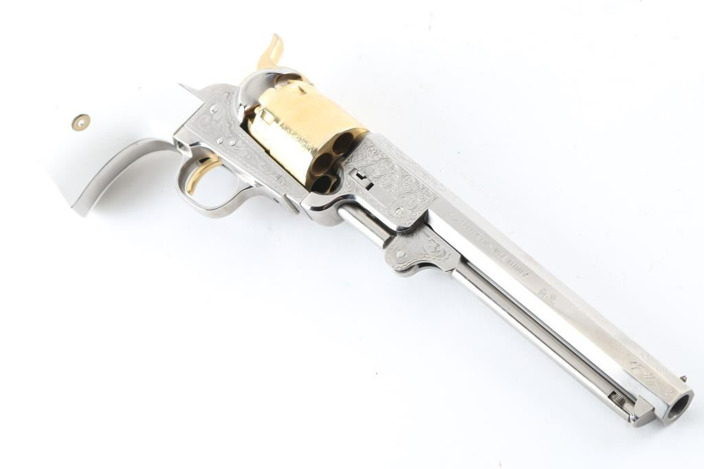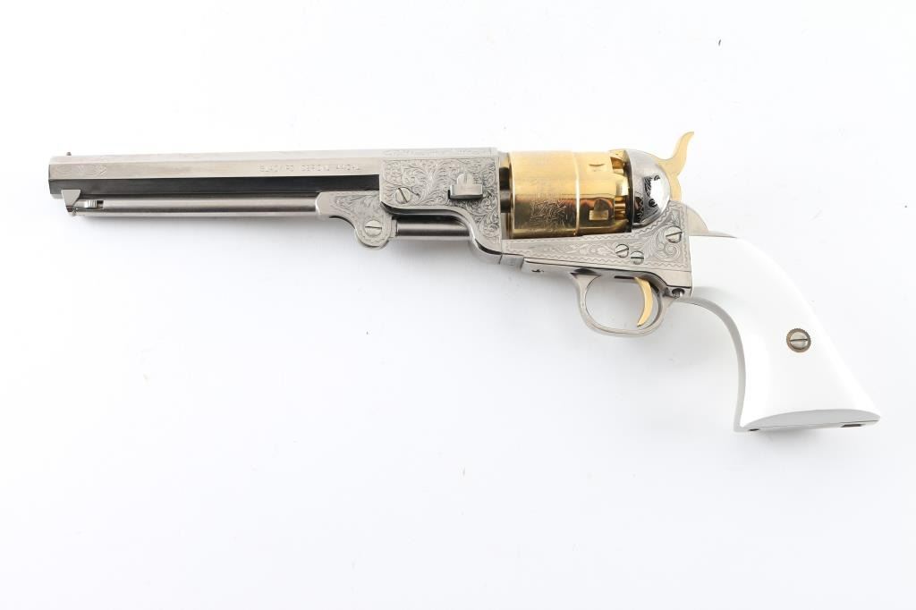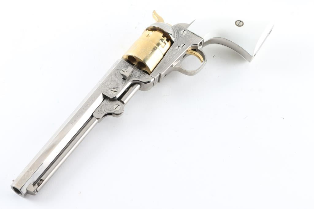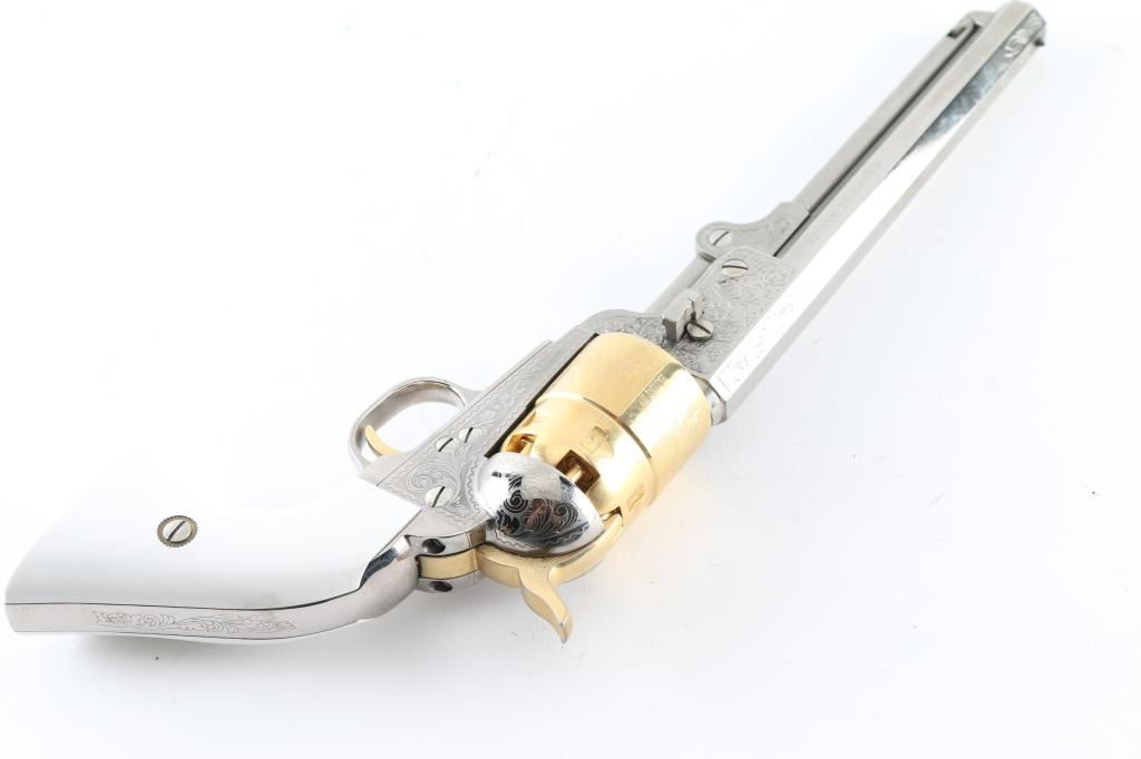 Italian made replica of a Colt 1851 Navy black powder revolver. Features nickel finish, 7.5" octagon barrel, loading lever under barrel, brass post front sight, rear sight notch in hammer nose, round triggerguard, rebated cylinder, two piece smooth white polymer grips. Floral scroll engraving covers 75% of visible surfaces, includes decorative stars on each side of barrel, roll engraved naval battle scene on gold finished cylinder. Appears unfired, with bright bore and charge holes. Overall like new condition, with minor handling marks. Gold wash finish is excellent. Condition is NRA Excellent *** Antique Firearm ***
