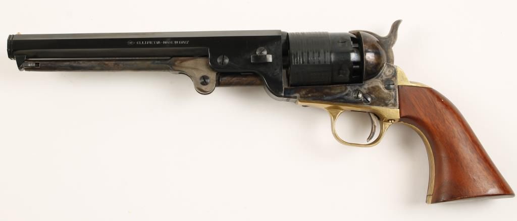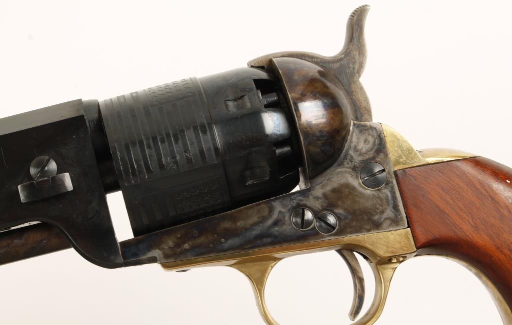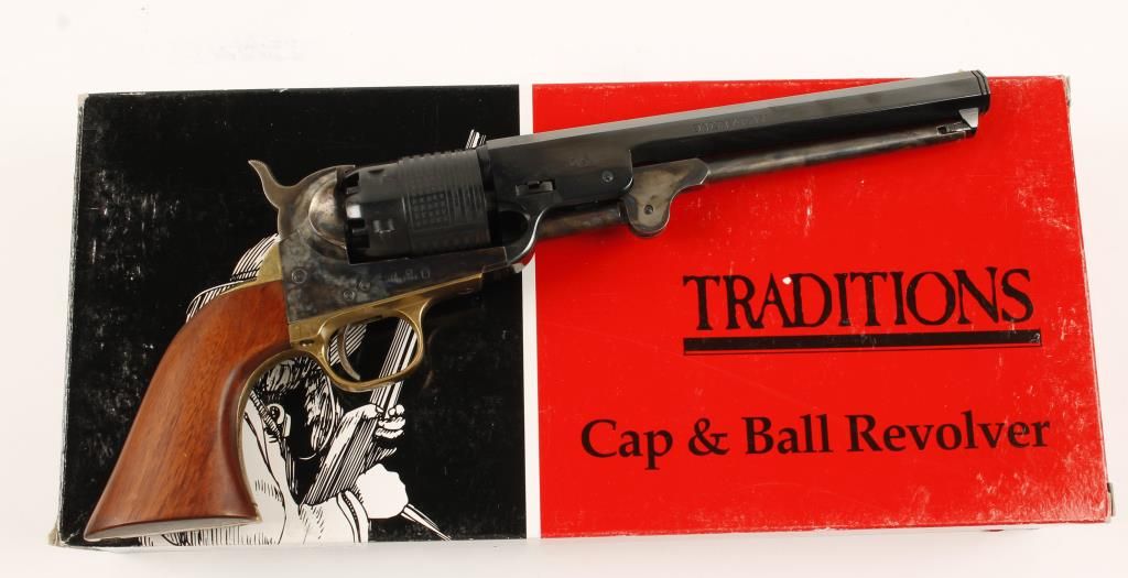 Replica black powder single action 6-shot percussion pistol. Part of Traditions North-South series. Blued 7-1/2" barrel with "Limited Edition 1 of 1000" and "Union Army" on it. Case colored loading lever, frame, hammer and trigger. Blue and roll-stamped cylinder showing the Stars & Stripes. Brass trigger guard and backstrap. Cut for a shoulder stock. Includes factory box with documents. Condition is like new in box. *Antique Firearm*
