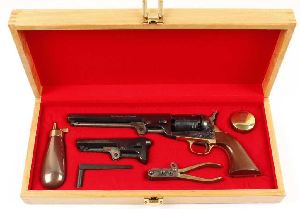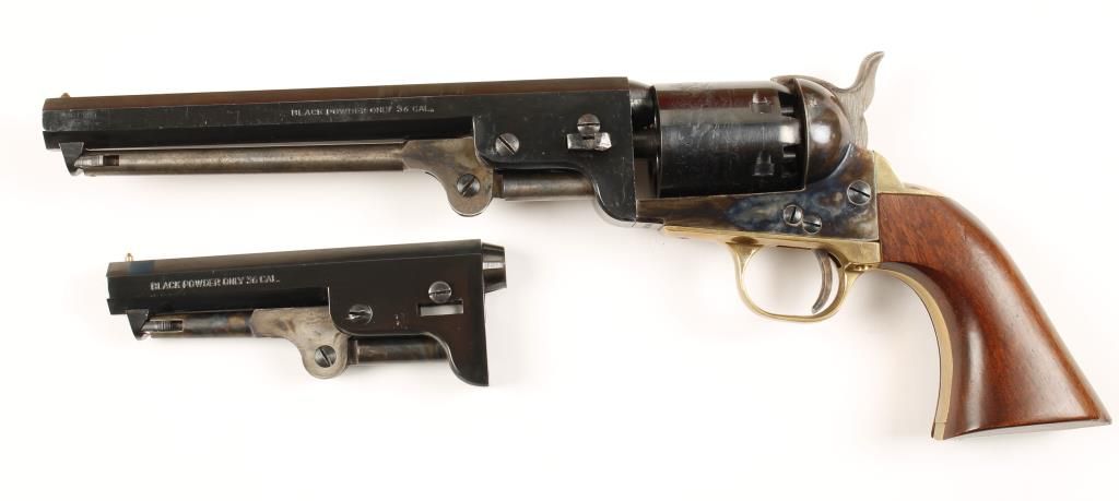 Cased with 2 barrels replica black powder single action 6-shot percussion pistol. Blued 7-1/2" and 5" octagon barrels with case colored loading levers. Blued and roll-stamped cylinders showing a naval engagement. Case colored frame, hammer and trigger. Brass trigger guard and backstrap cut for a shoulder stock. Lined hardwood case with loading and maintenance tools. Condition is good plus. *Antique Firearm*