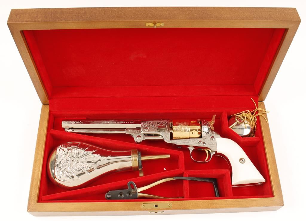Cased engraved and plated replica black powder single action 6-shot percussion pistol. Nickeled 7-1/2" barrel, loading lever, frame, trigger guard and backstrap. Gold plated cylinder, hammer and trigger. Cut for a shoulder stock. Lined hardwood case with loading and maintenance tools and a key. Includes factory box with documents. Condition is like new in box. *Antique Firearm*