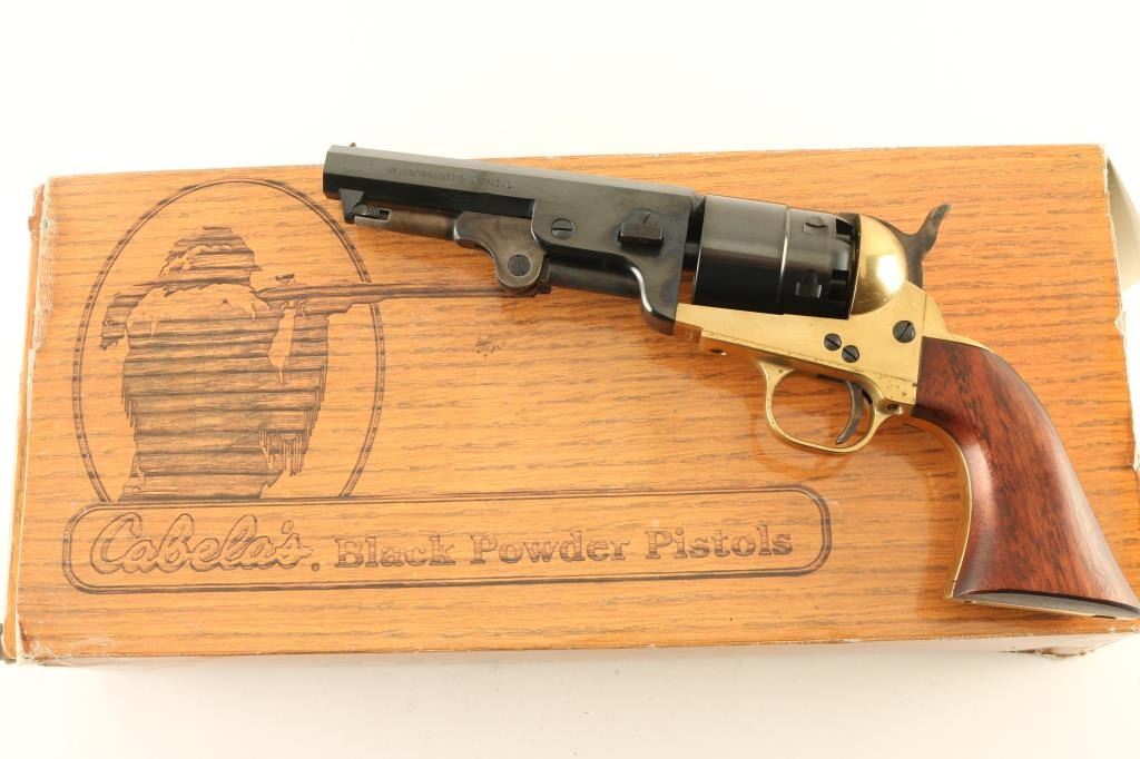 Revolver. Percussion. 6-rd capacity. Italian made copy of the Civil War era Colt Model 1851 Navy. This revolver has a 4 3/4" barrel, and shortened loading lever, and thus the Sheriff model. No scene on cylinder. Blued finish. Smooth wood grips. Brass frame & triggerguard. Italian proof marks. bore, and cylinders appear excellent. Blued finish is about 99%, with a couple of light scratches. Wood grips are excellent. Frame, and triggerguard have some light spotting. Action is crisp/tight. Comes in the original Cabelas box. Box torn.