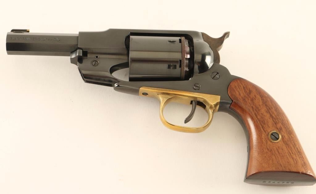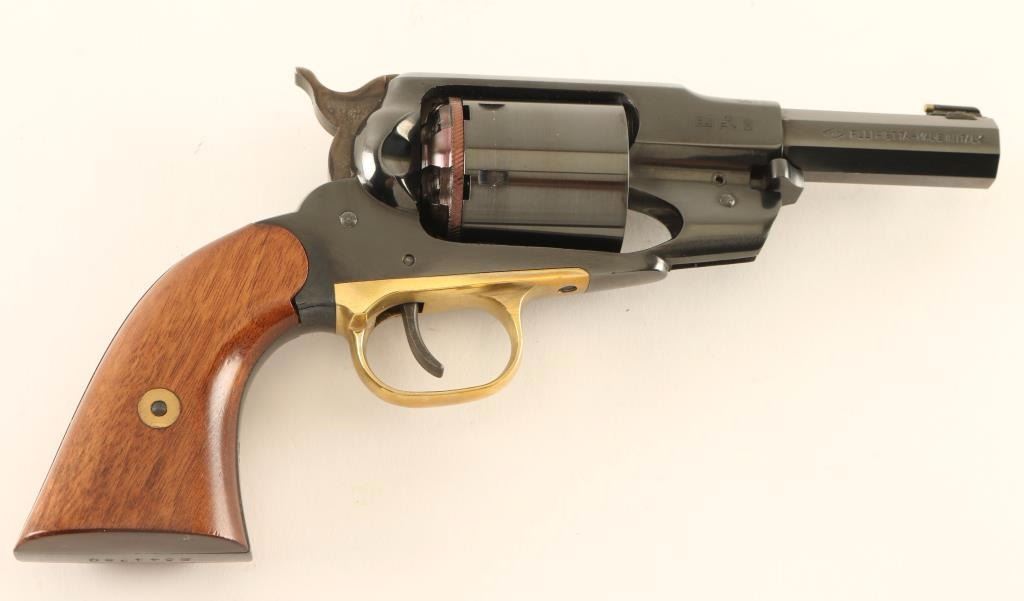 Italian made single action percussion revolver converted to .44 caliber blackpowder cartridge, circa 2004. Features a blued finish, cut-down 4" octagon barrel, dovetailed blade front sight with brass bead, 'v' notched rear sight, removed loading lever, non-fluted six shot cylinder, smooth trigger, brass trigger guard, case hardened hammer with serrated spur and smooth two-piece wood grips. Revolver retains approximately 92% of it's original blued finish showing a few areas of light scattered wear and some pin prick pitting on the hammer. Action is smooth, bore is excellent and wood grips are very good+. Condition is very good+. ***Modern Firearm***