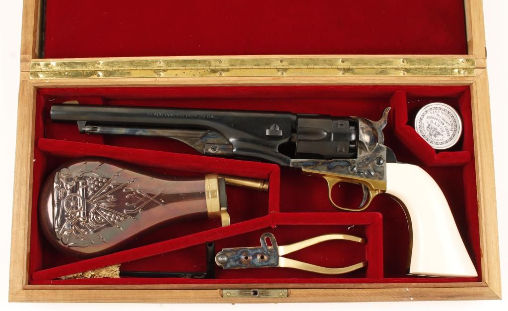 Cased replica black powder single action 6-shot percussion pistol. Blued 8" barrel. Case colored loading lever, frame, hammer and trigger. Blued half-fluted cylinder. Brass trigger guard. Imitation ivory grips. Not cut for a shoulder stock. Lined hardwood case with loading and maintenance tools and a key. Condition is like new in box. *Antique Firearm*