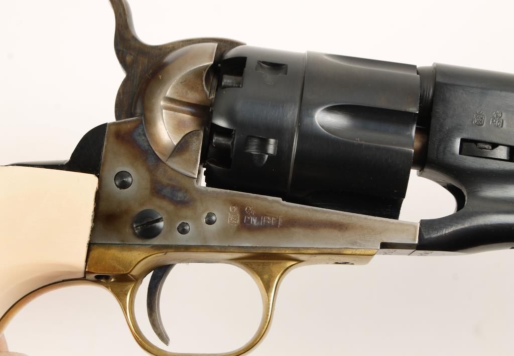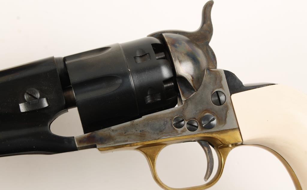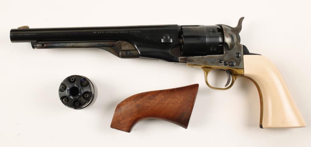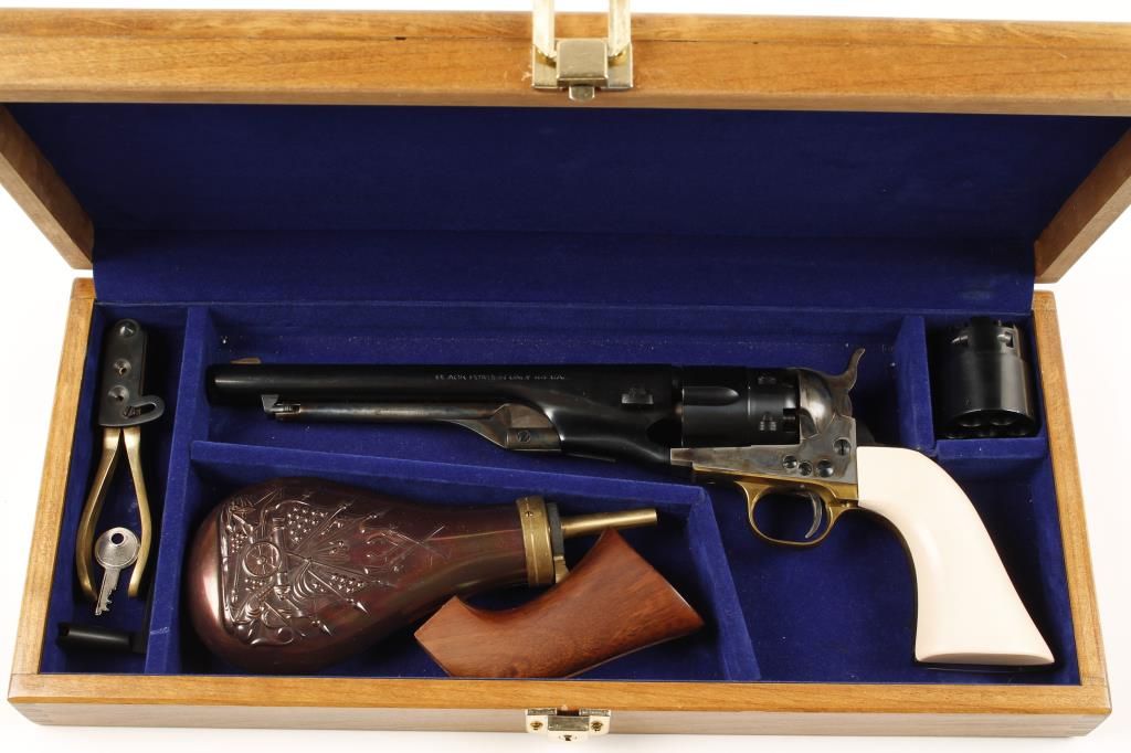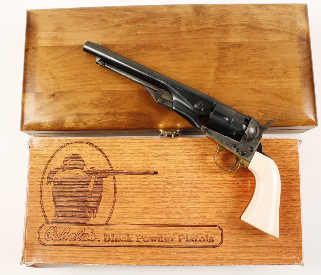 Cased replica black powder single action 6-shot pistol. 8" blued barrel. Case colored loading lever, frame, hammer and trigger. Blued half-fluted cylinder and blued unfluted cylinder. Brass trigger guard. Blued backstrap cut for a shoulder stock. Imitation ivory grips and a one piece wood grip. Hardwood velvet lined lockable case containing loading and maintenance tools. Includes original Cabela's box. Condition is like new in box. *Antique Firearm*