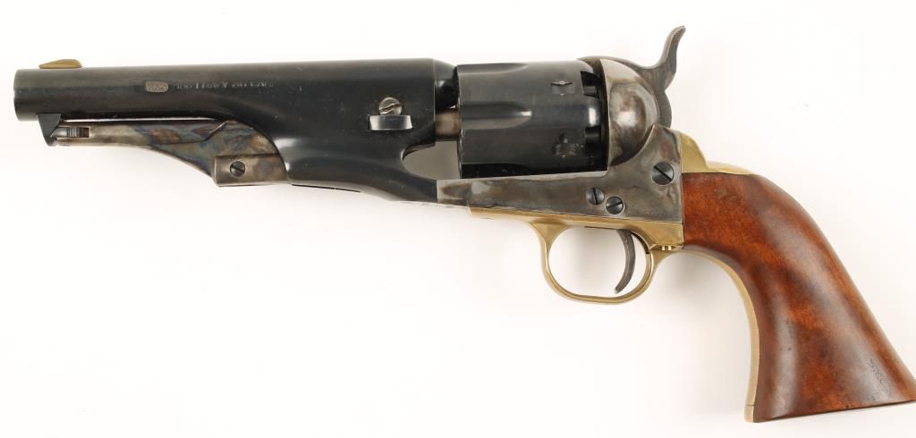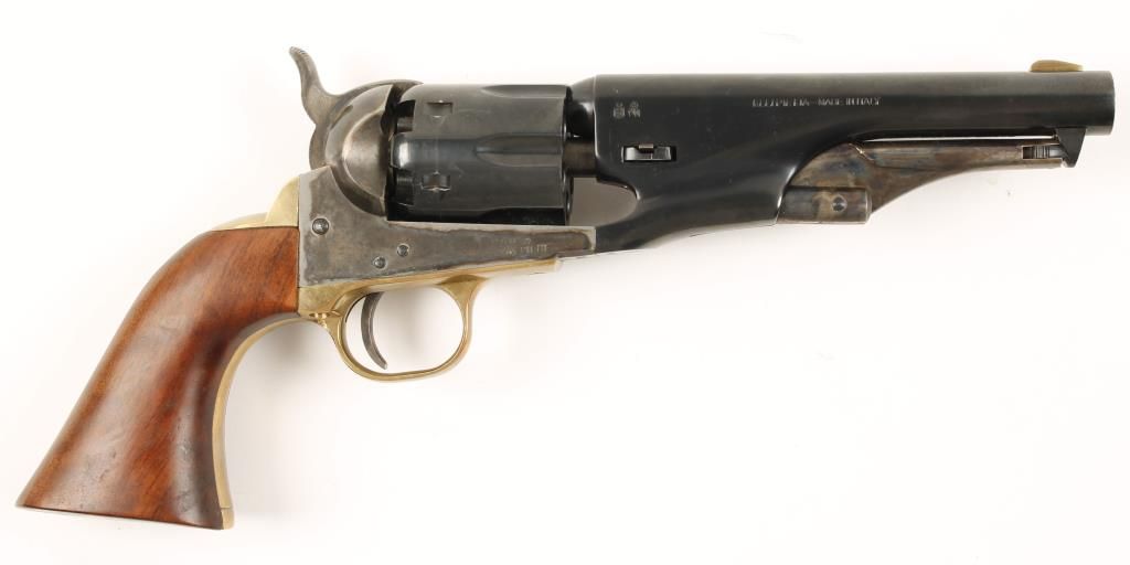 Replica black powder single action 6-shot pistol. 5-1/2" blued barrel. Case colored loading lever, frame, hammer and trigger. Blued half-fluted cylinder. Brass trigger guard and backstrap. Cut for a shoulder stock. Condition is good with unmatched serial numbers on barrel and receiver. *Antique Firearm*