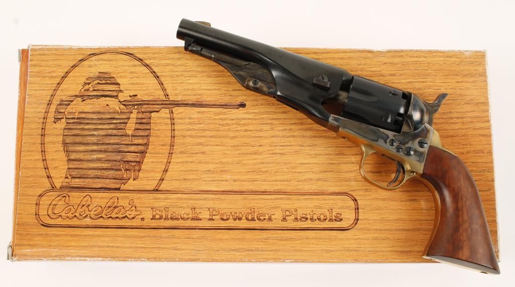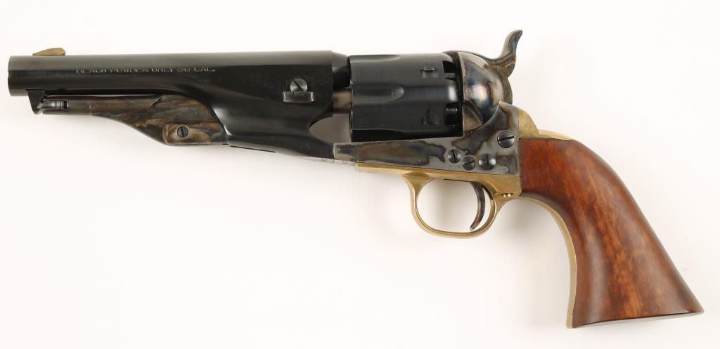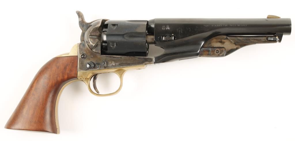 Replica black powder single action 6-shot percussion pistol. Blued 5-1/2"barrel. case colored loading lever, frame, hammer and trigger. Blued half-fluted cylinder. Brass trigger guard and backstrap. Cut for a shoulder stock. Includes factory box and documents. Condition is like new in box. *Antique Firearm*