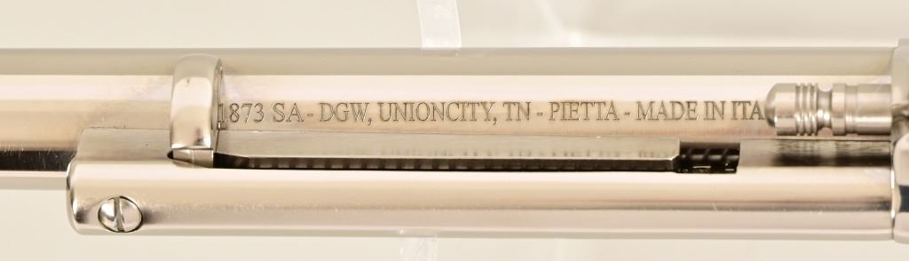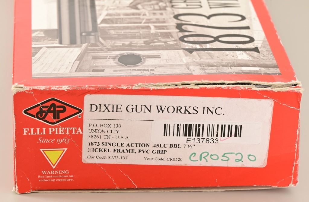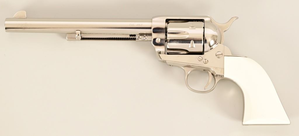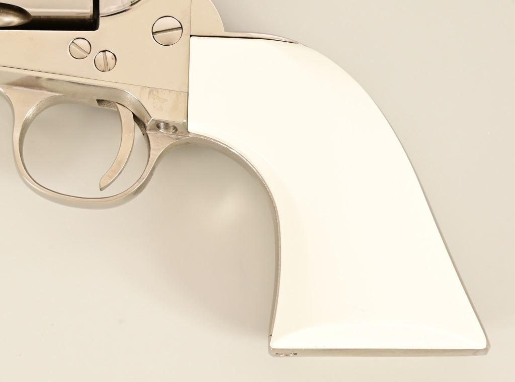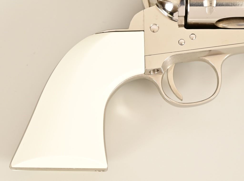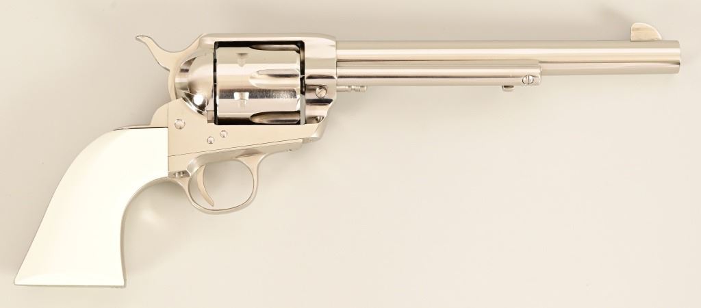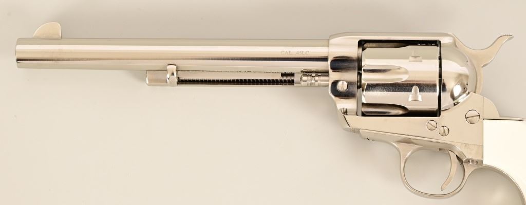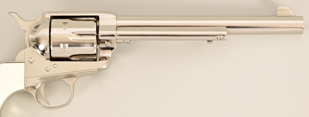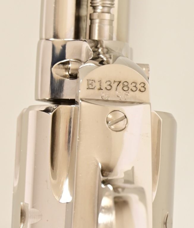 S/N E137833. Like new condition, in factory box. Nickel with 7.5" barrel. White plastic grips. Modern.