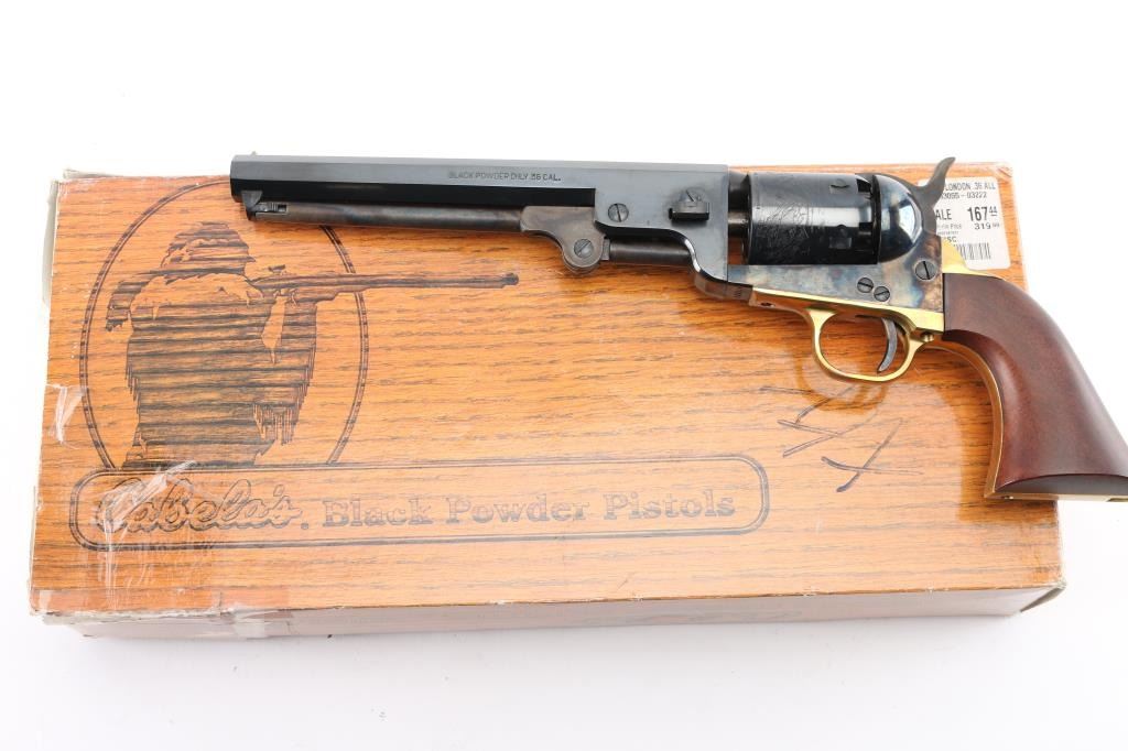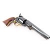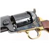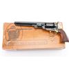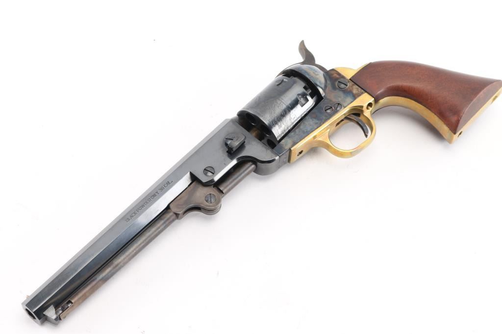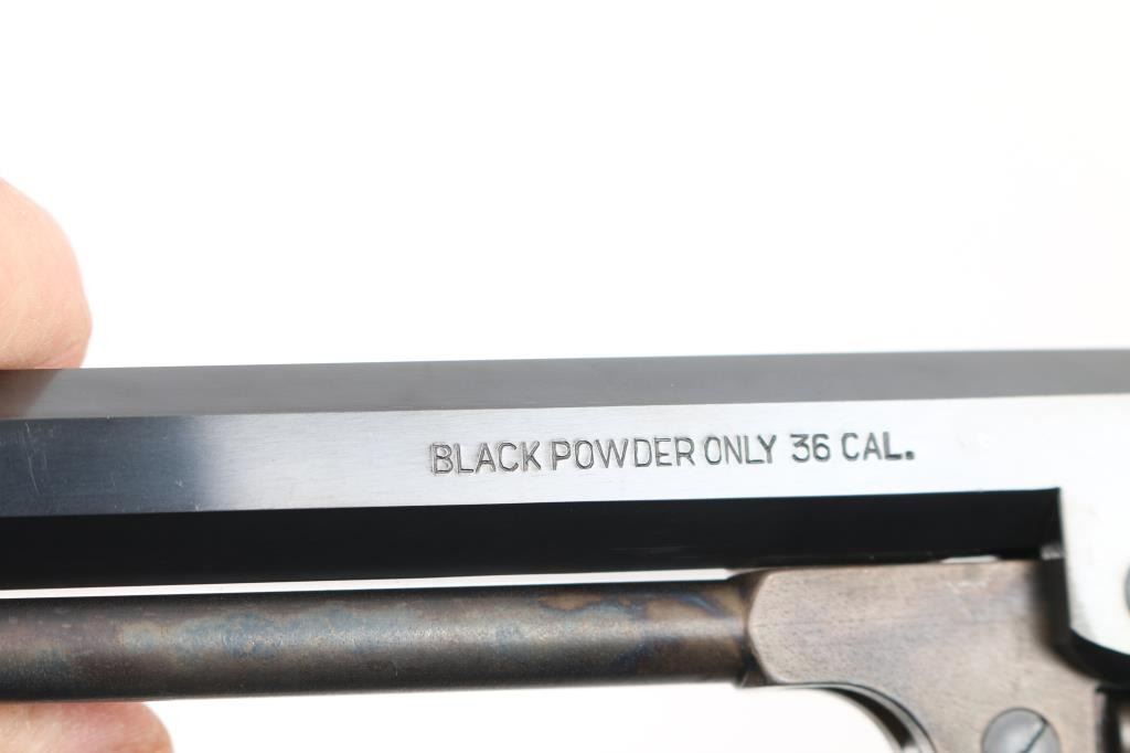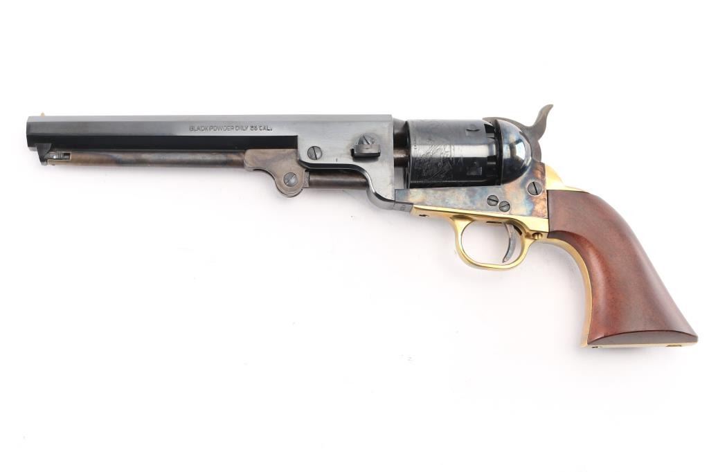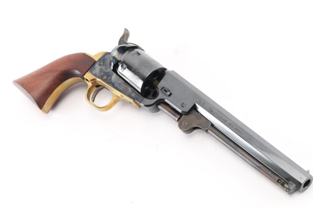 Italian reproduction of the 1851 model Colt cap-n-ball percussion revolver. For black powder only. Features blued & case colored finish, brass round triggerguard, brass backstrap, 7.5" octagon barrel, brass cone front sight, rear sight on hammer lip, six shot unfluted cylinder with roll engraved battle scene, loading lever, one piece smooth walnut grip. Condition is like new, no signs of firing, with few minor blemishes. Condition is NRA Excellent - like new *** "Antique" Firearm ***