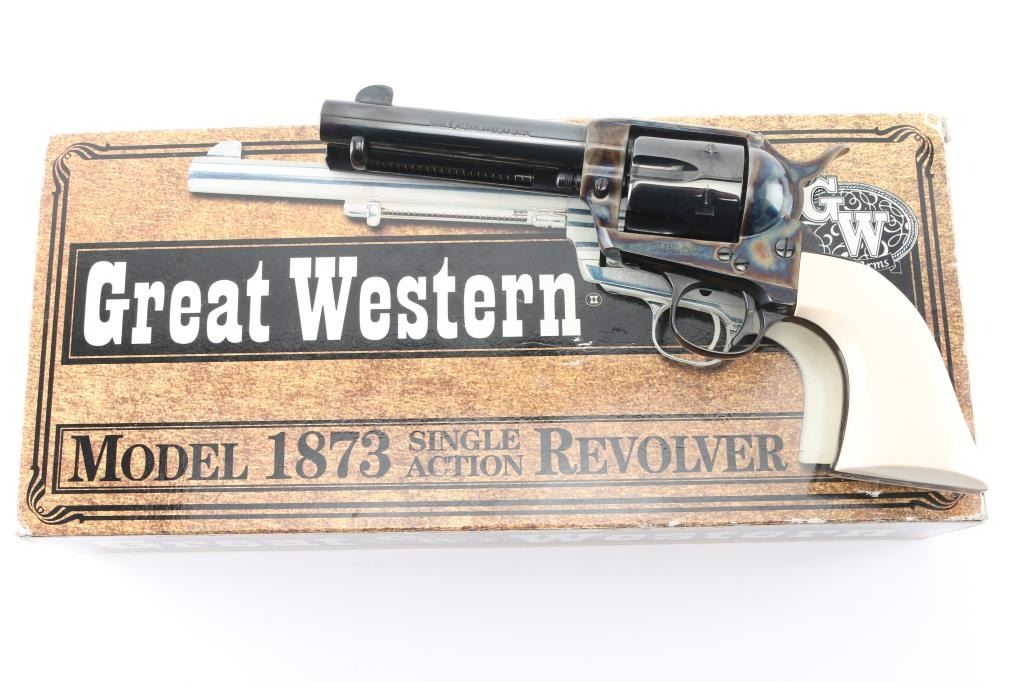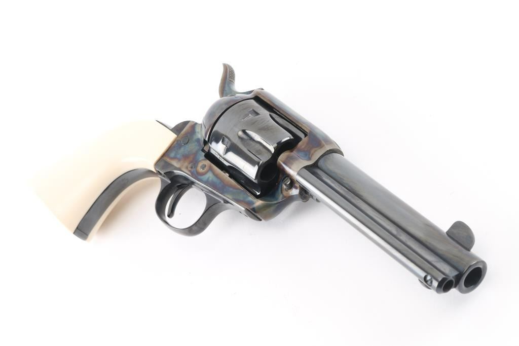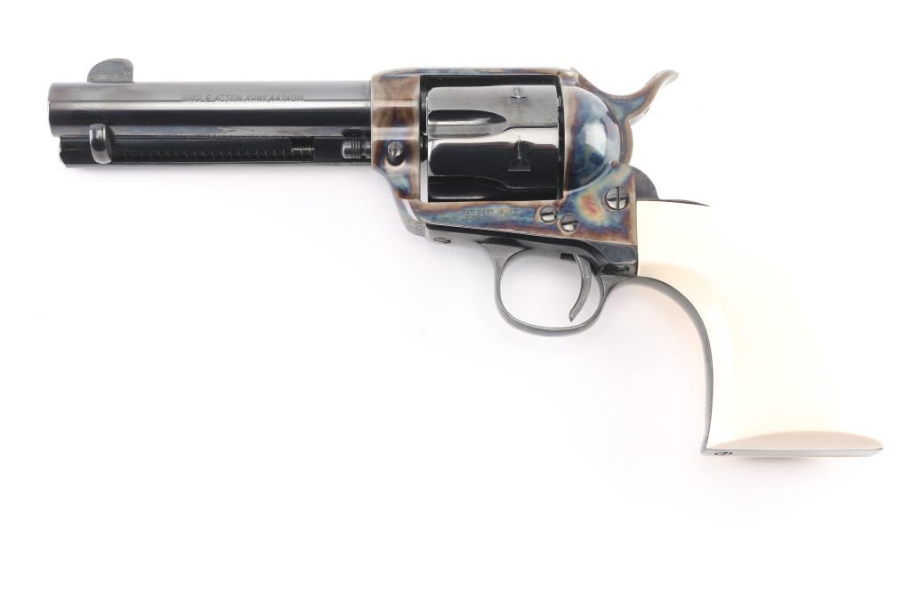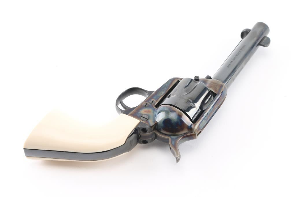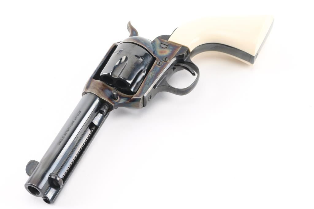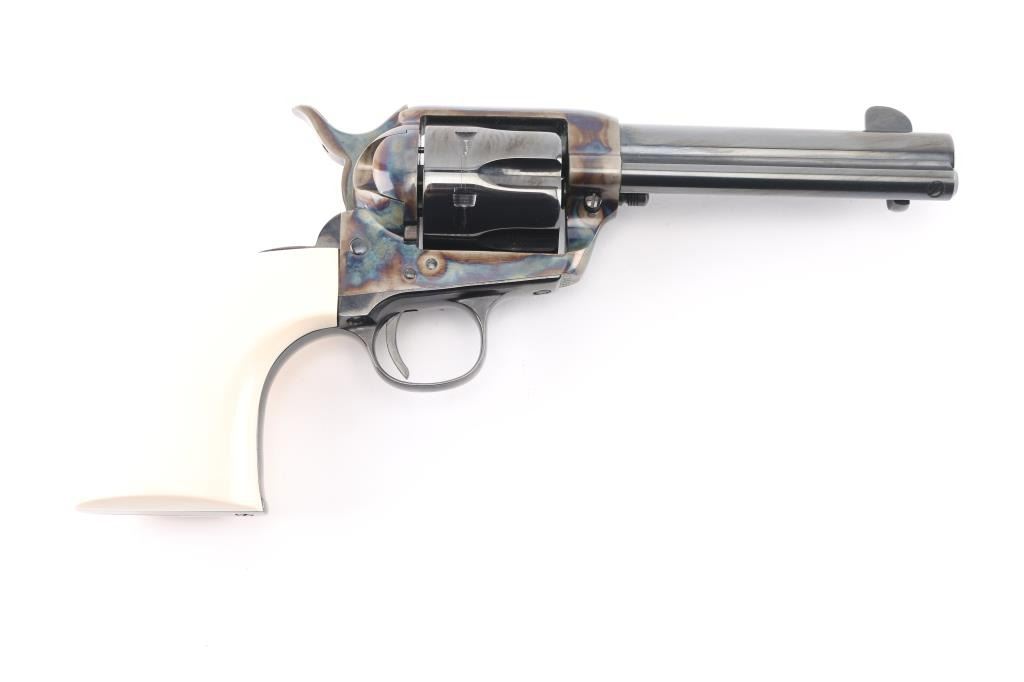 'Californian' Italian made single action six-shot revolver imported by EMF, Santa Ana CA. Close copy of the Colt 1873 Single Action Army, chambered for 44-40 Winchester cartridges. Features blued finish (with case colored frame, loading gate, hammer), 4 3/4" barrel, blade front sight, square notched rear sight, smooth thin trigger, knurled hammer spur, fluted cylinder, ejector rod, one piece smooth Tru Ivory polymer grip. Overall like new condition with minor handling marks. Includes extra one piece smooth walnut grip, factory box with paperwork. Condition is NRA Excellent - like new *** Modern Firearm ***