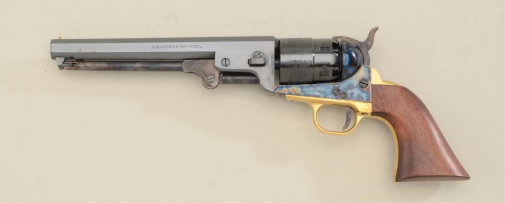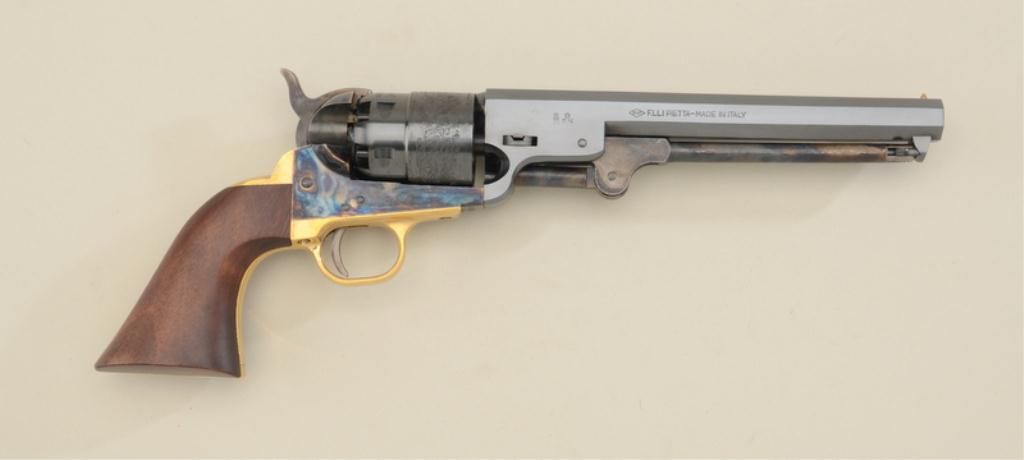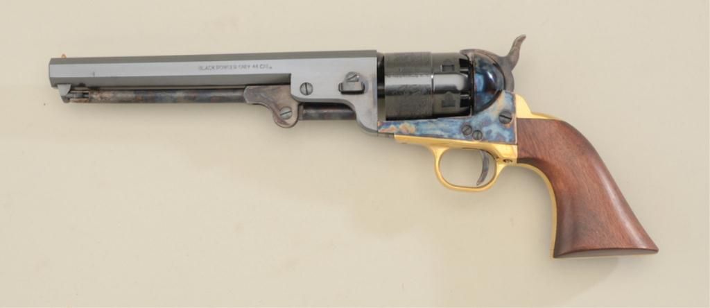 Pietta Italian-made modern percussion revolver, .44 cal., 7-1/4” barrel, blue and case hardened finish, wood grips, #592863. This gun is in overall excellent condition showing little handling; with factorycardboard box, inserts and instructions. Est.: $300-$600.