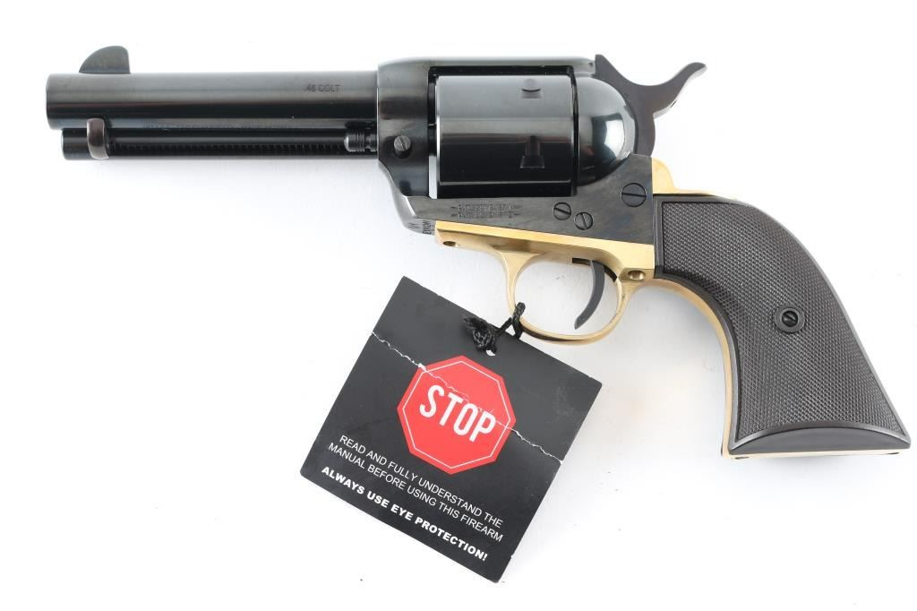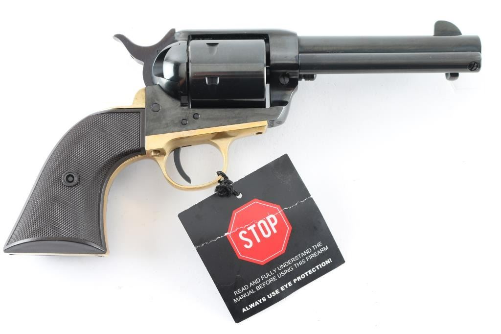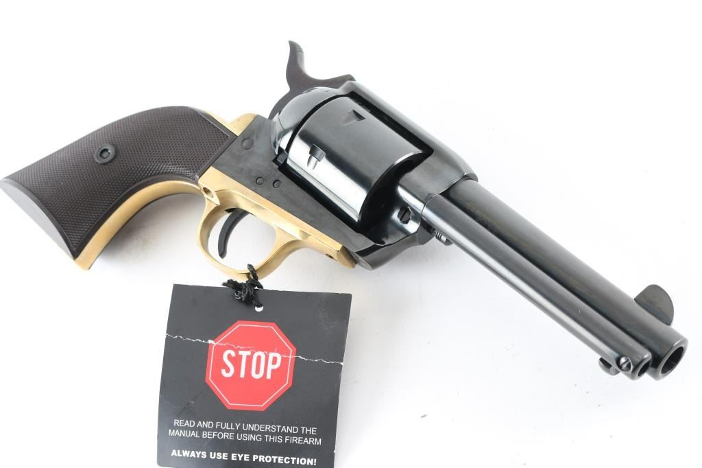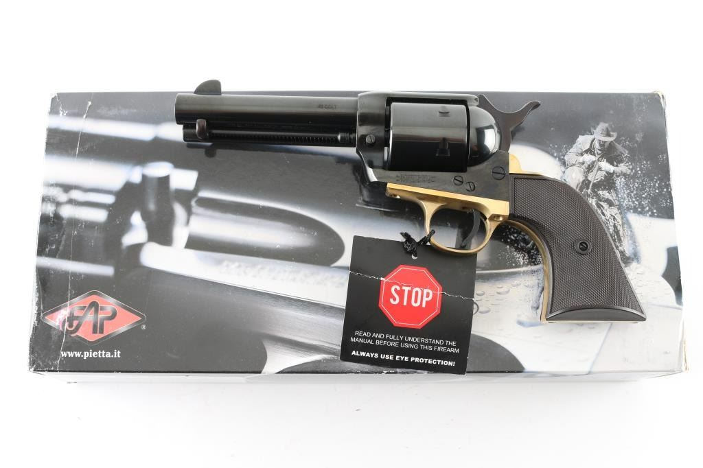 Made in Italy this Davidson's Exclusive is another great reproduction from Pietta chambered for the traditional 45 Colt, circa 2020. It is an 1873 Gen II Single Action Revolver featuring a blued 4.75" barrel and receiver with fixed blade front sight and notched rear sight. It has a brass backstrap and trigger guard with two piece brown checkered grips. The metal finish and grips look new with no signs of use or handling. The bore looks very good, needs cleaned. Comes with original factory box stating Davidson's Exclusive. Great gun for collectors or shooters. Condition is NRA Excellent+ *Modern Firearm*