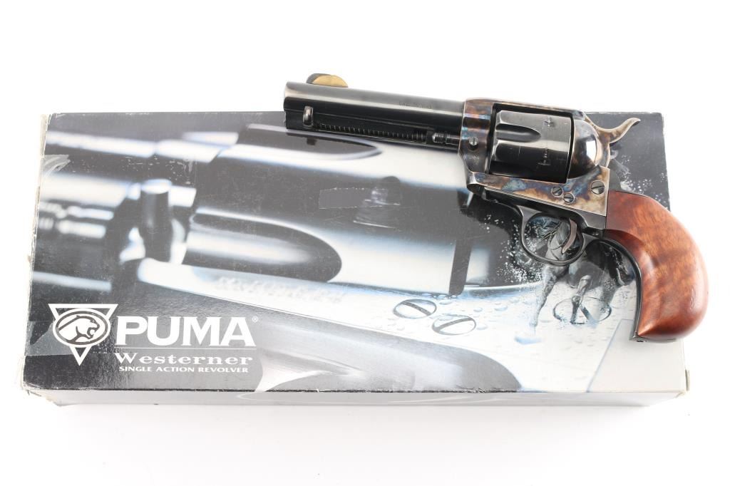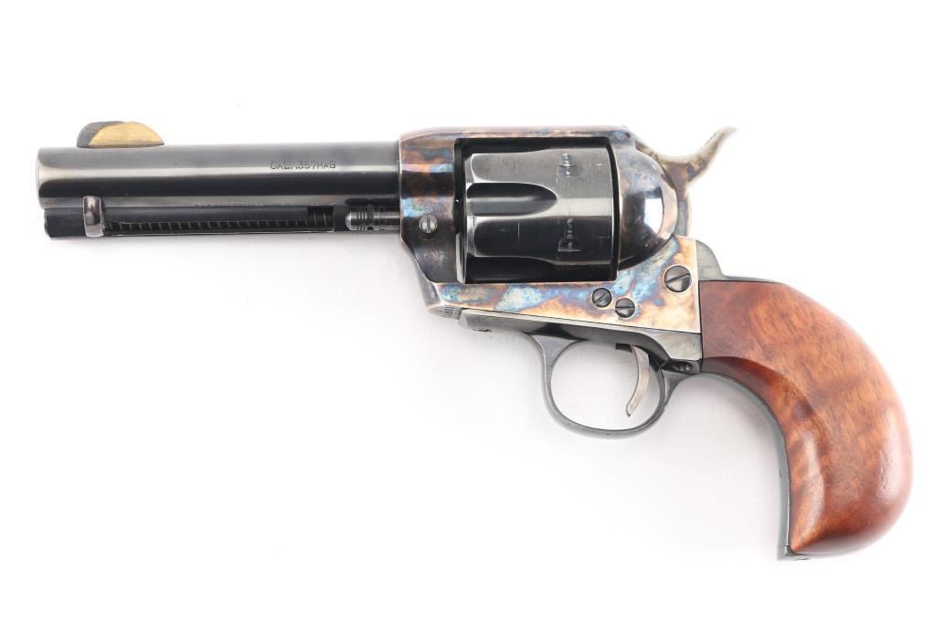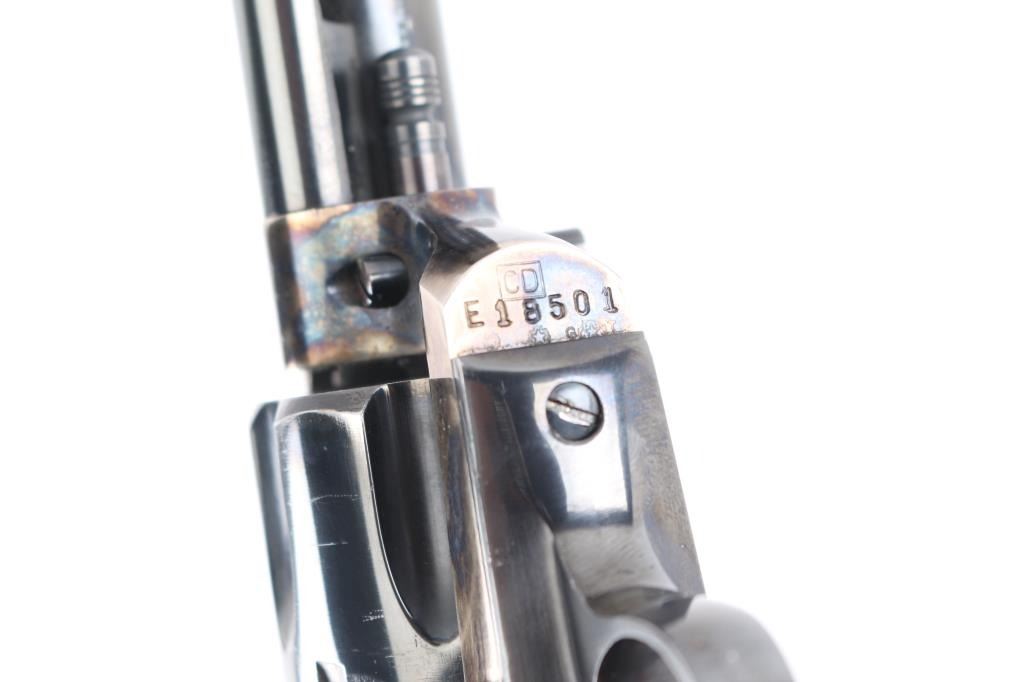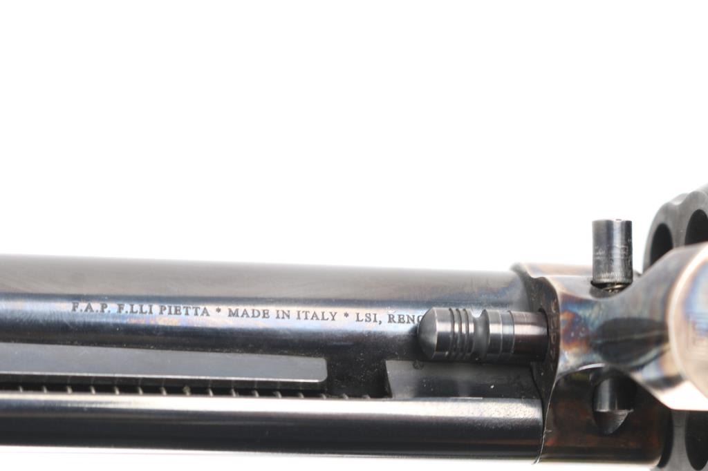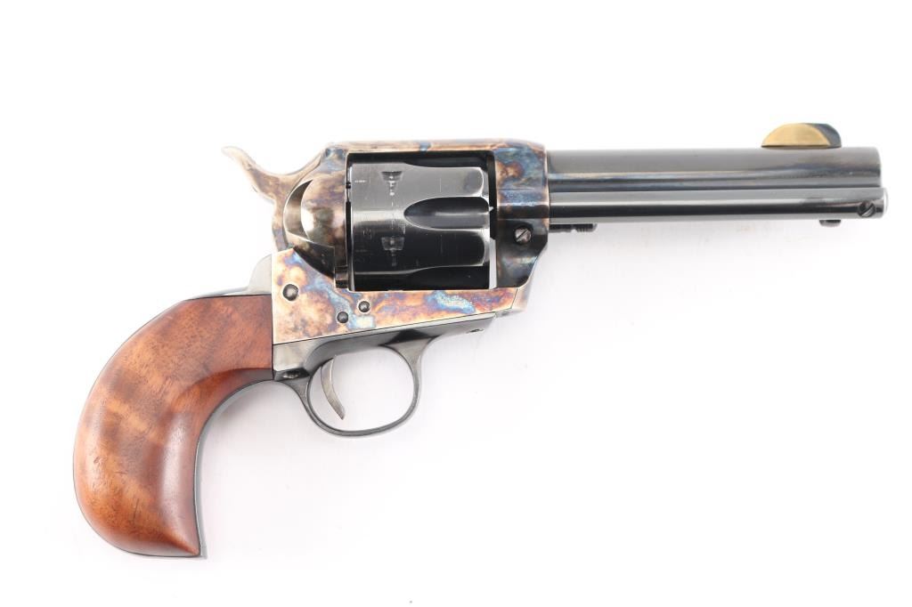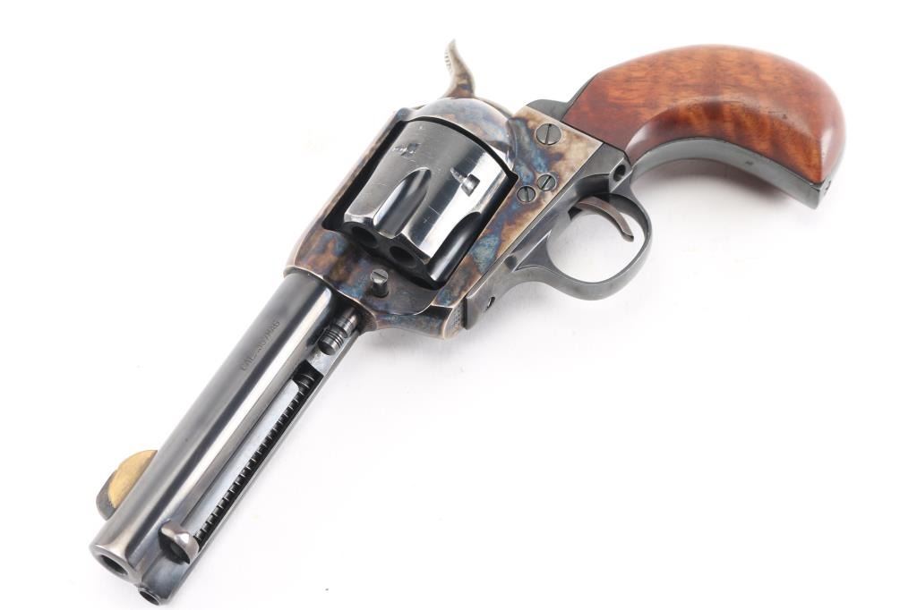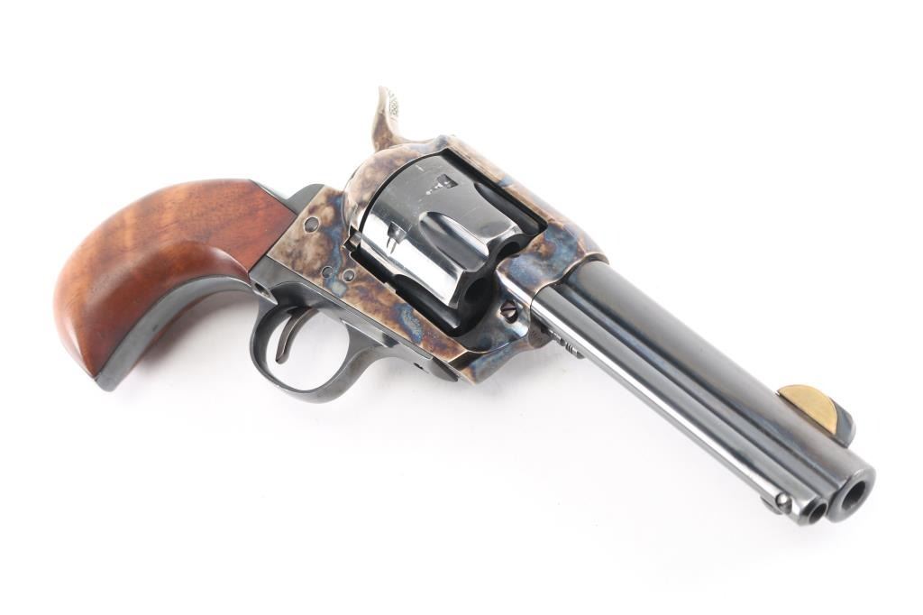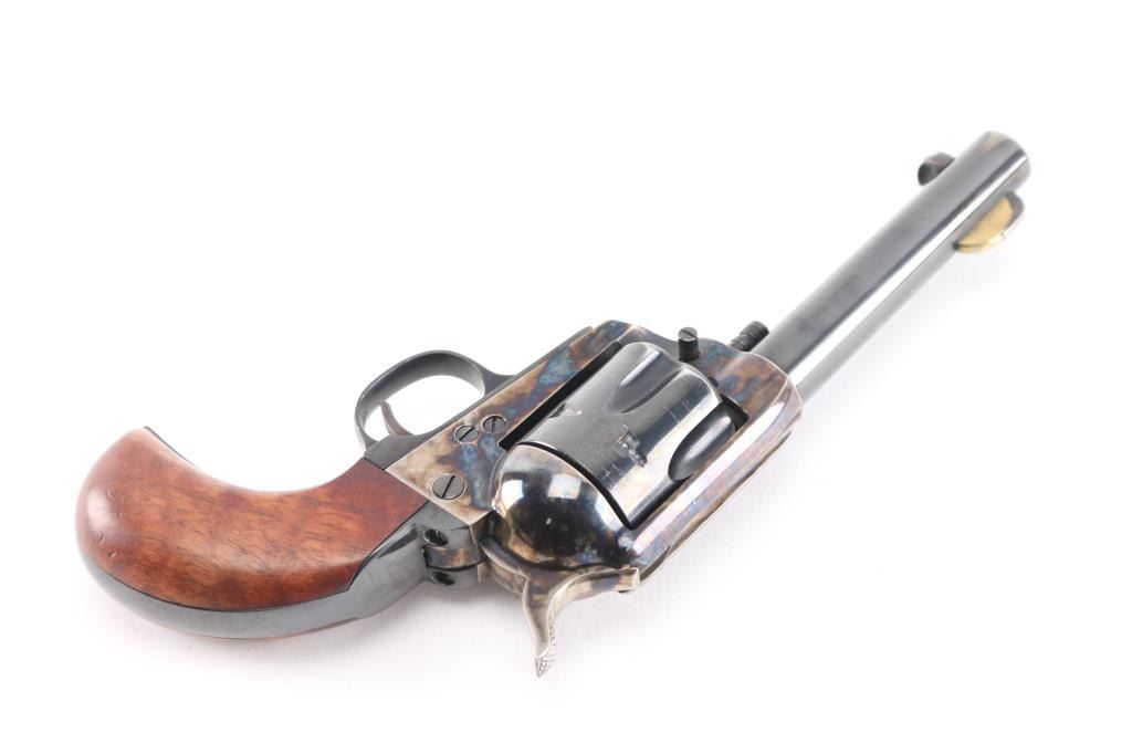 Italian made replica of a Colt1877 Lighting. imported by Legacy Sports Intl. Features single action operation, blued & case color finish, two piece smooth walnut 'Birds Head" grips, 4-3/4" barrel, a piece of rounded copper has been added to the partridge front sight for better visibility, making it a blade, fluted 6 shot cylinder. Bore & charge holes are excellent. Retains 95% finish with minor holster wear on the muzzle, cylinder, and ejector rod housing, cylinder has tracking, & and minor sctraches. Case colors are fiery. Grips are excellent. Smooth action, tight lock up. Comes in matching factory box.