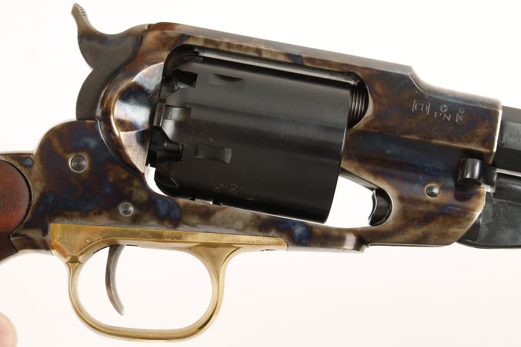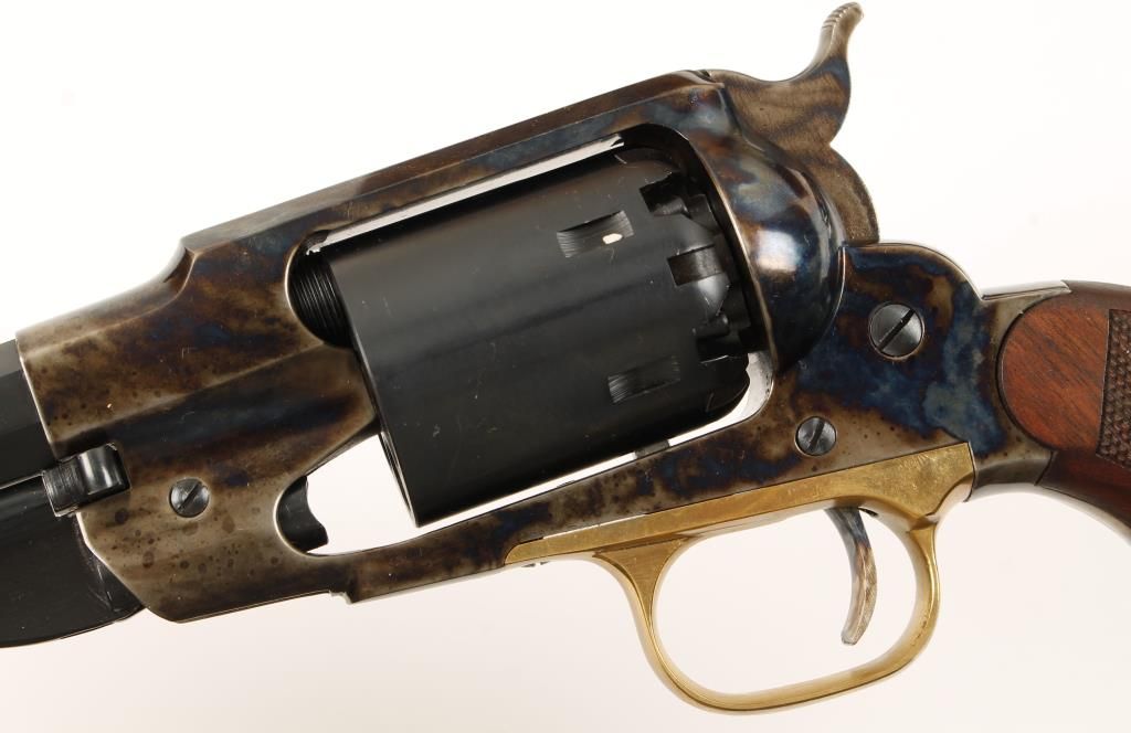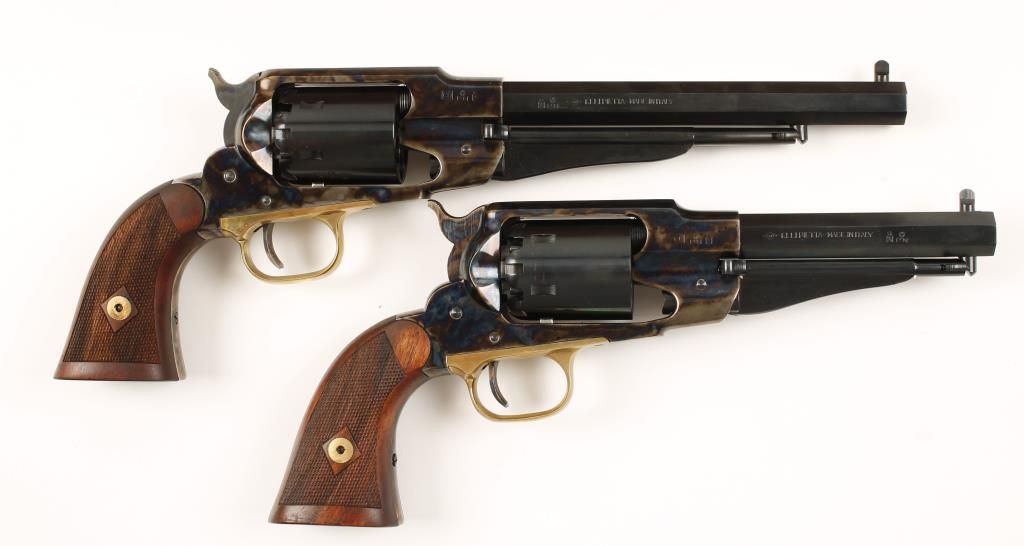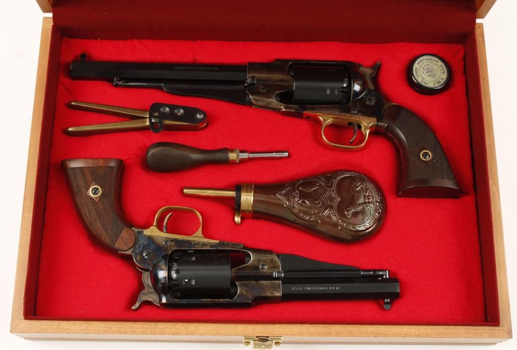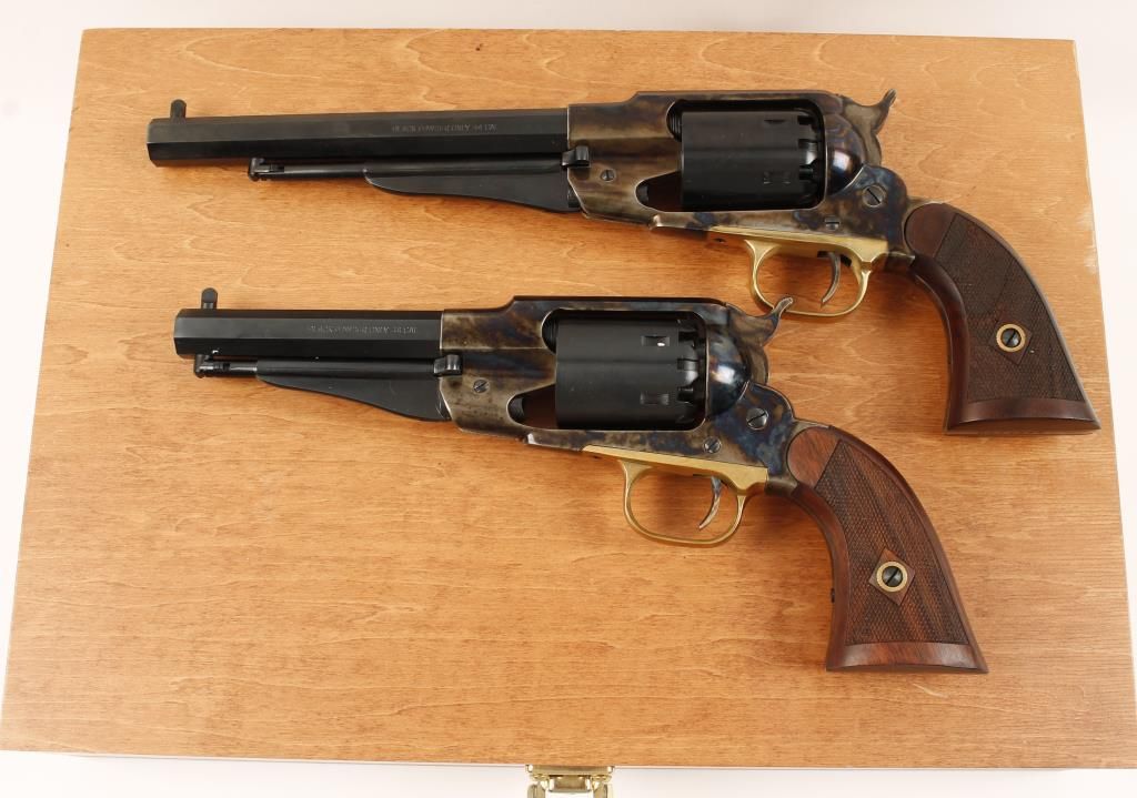 Cased set of two replica black powder single action 6-shot pistols. Blued 7-1/2" and 5-1/2" barrels, loading levers and cylinders. Case colored frames, hammers and triggers. Brass trigger guards. Not cut for shoulder stocks. Checkered hardwood grips. Hardwood case is velvet lined and cut to fit the pistols and the enclosed tools. Condition is like new in box. Includes the original pistol boxes from Cabela's. *Antique Firearm*