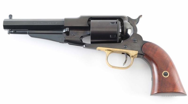 Reproduction of the Remington New Model Army single action percussion revolver that was converted to fire .45 Colt 'cowboy loads', manufactured in Italy circa 2011. Features a blued finish, 5 1/2" octagonal barrel, pinched post front sight, 'v' notched rear sight, smooth wide trigger, serrated hammer spur, non-fluted six shot conversion cylinder, loading lever, brass trigger guard, and two-piece smooth wood grips. Revolver retains approximately 98% of its blued finish showing only light handling marks/scuffs. Action is smooth, the bore is pristine and the wood grips are fine. Condition is NRA Excellent. ***Modern Firearm***