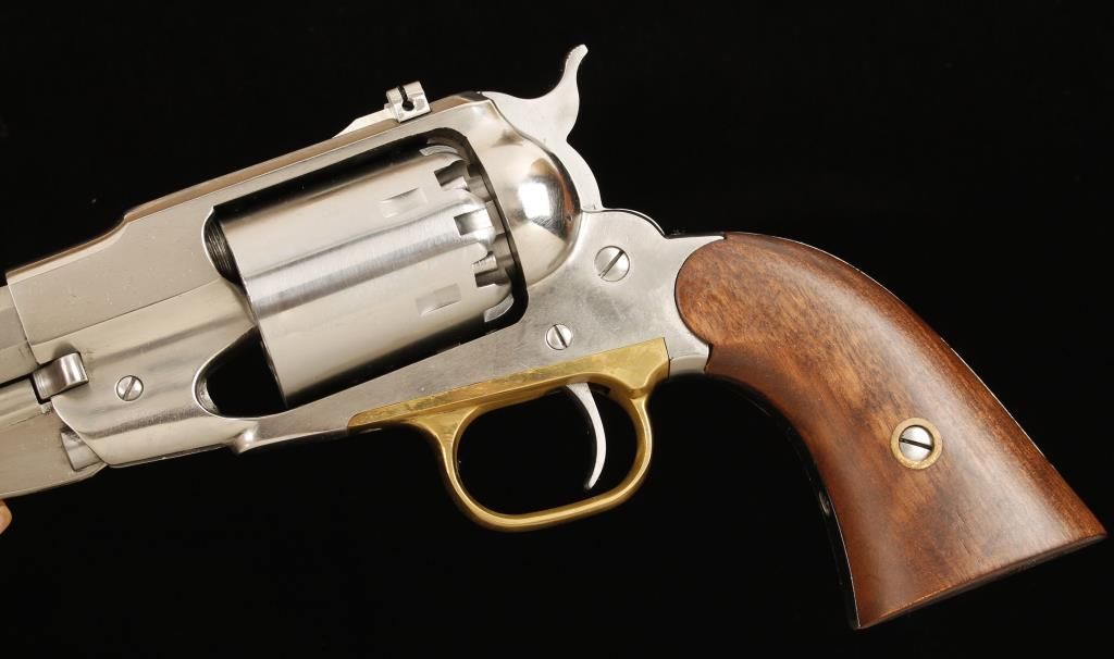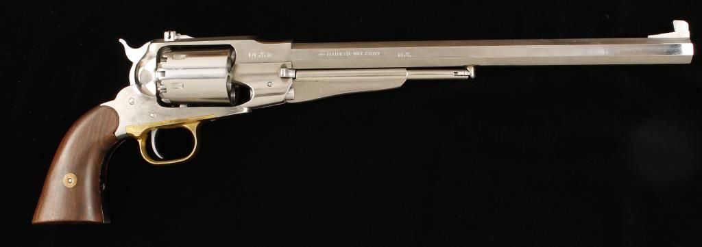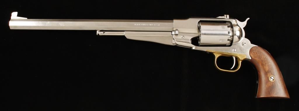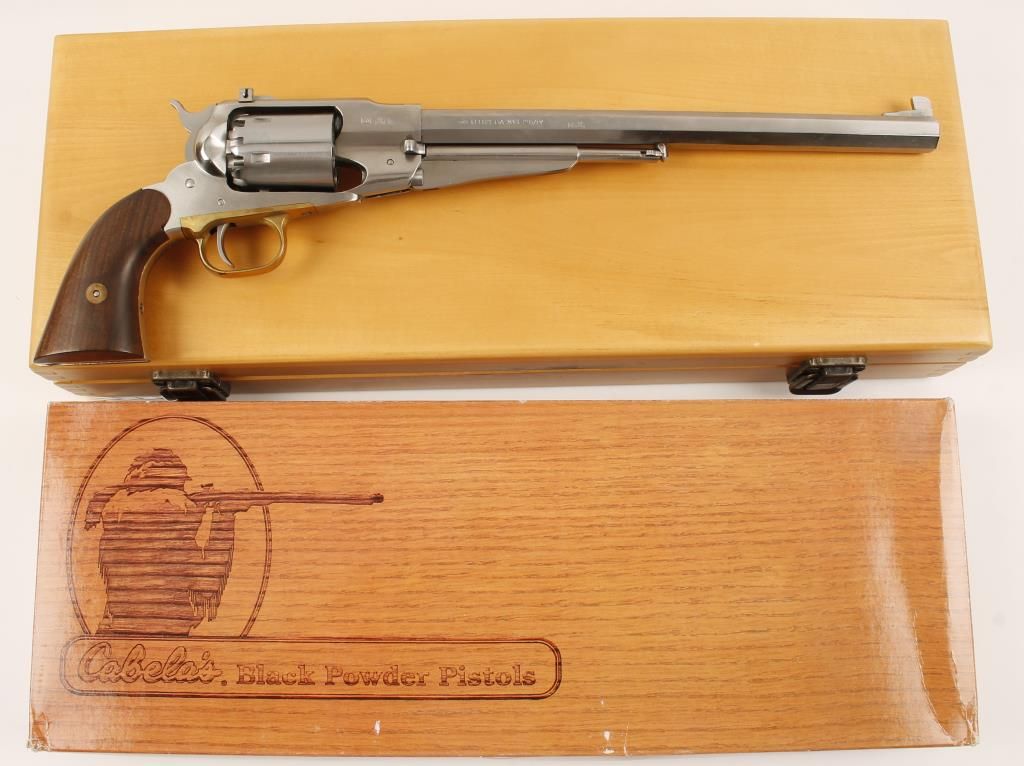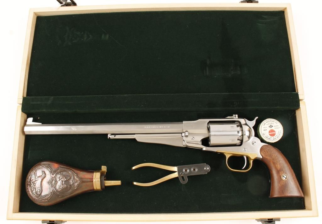 Cased stainless steel replica black powder single action 6-shot percussion pistol. 12" barrel with ramp front sight. Adjustable rear sight. Brass trigger guard. Not cut for a shoulder stock. Lined hardwood case with loading tools. Includes factory box and documents. Condition is like new in box. *Antique Firearm*