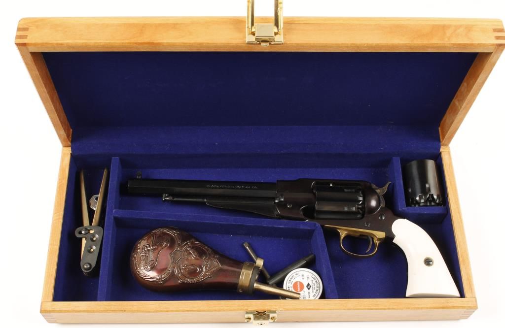 Cased replica black powder single action 6-shot percussion pistol. Blued 8" octagon barrel. Case colored hammer and trigger. Blued loading lever. Blued full-fluted cylinder. Blued frame. Brass trigger guard. Imitation ivory grips. Not cut for a shoulder stock. Lined hardwood case with loading and maintenance tools and a key. Includes factory box and documents for pistol. Condition is like new in box. *Antique Firearm*