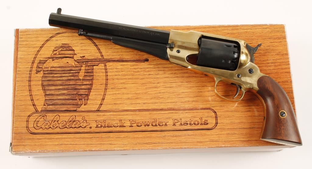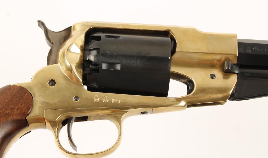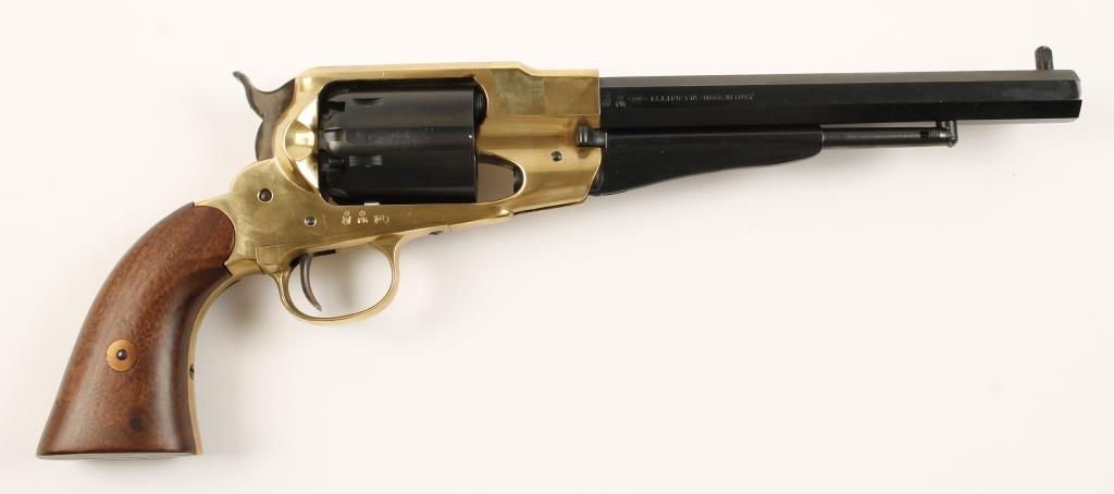 Replica black powder single action 6-shot percussion pistol. Blued 8" octagon barrel. Blued loading lever and cylinder. Case colored hammer and trigger. Brass frame and trigger guard. Not cut for a shoulder stock. Includes factory box with documents. Condition is like new in box. *Antique Firearm*