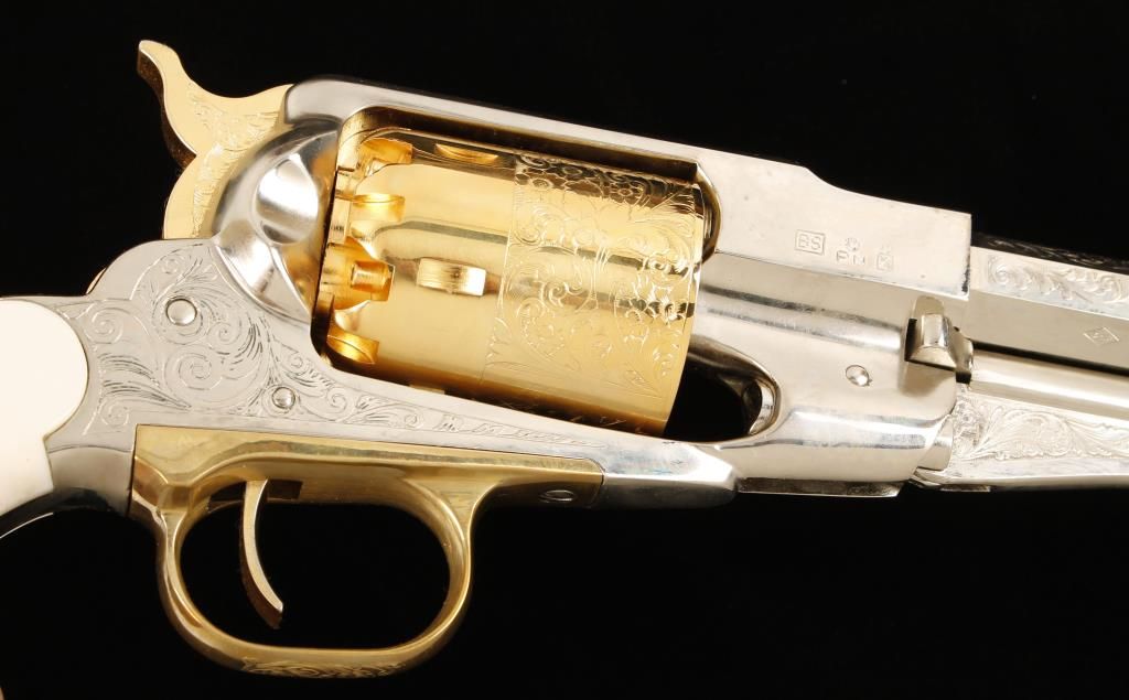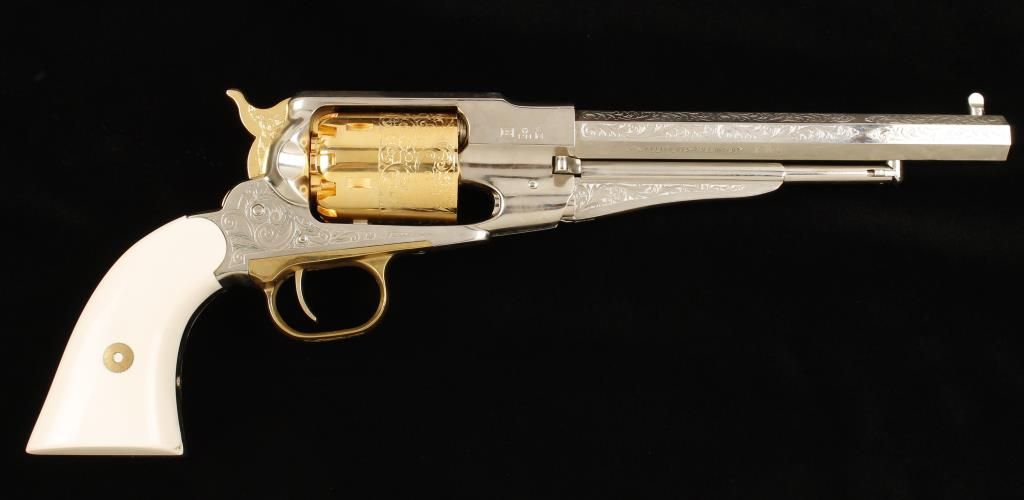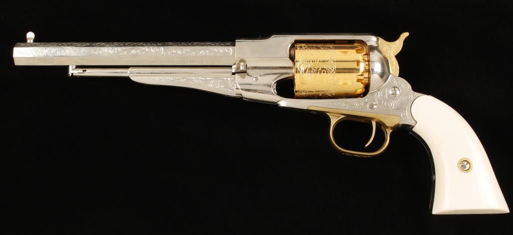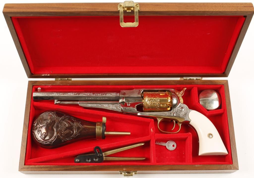 Cased plated and engraved replica black powder single action 6-shot percussion pistol. Nickel plated 8" octagon barrel, loading lever and frame. Gold colored cylinder, hammer and trigger. Brass trigger guard. Not cut for a shoulder stock. Lined hardwood case with loading tools and a key. Condition is like new in box. *Antique Firearm*