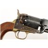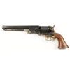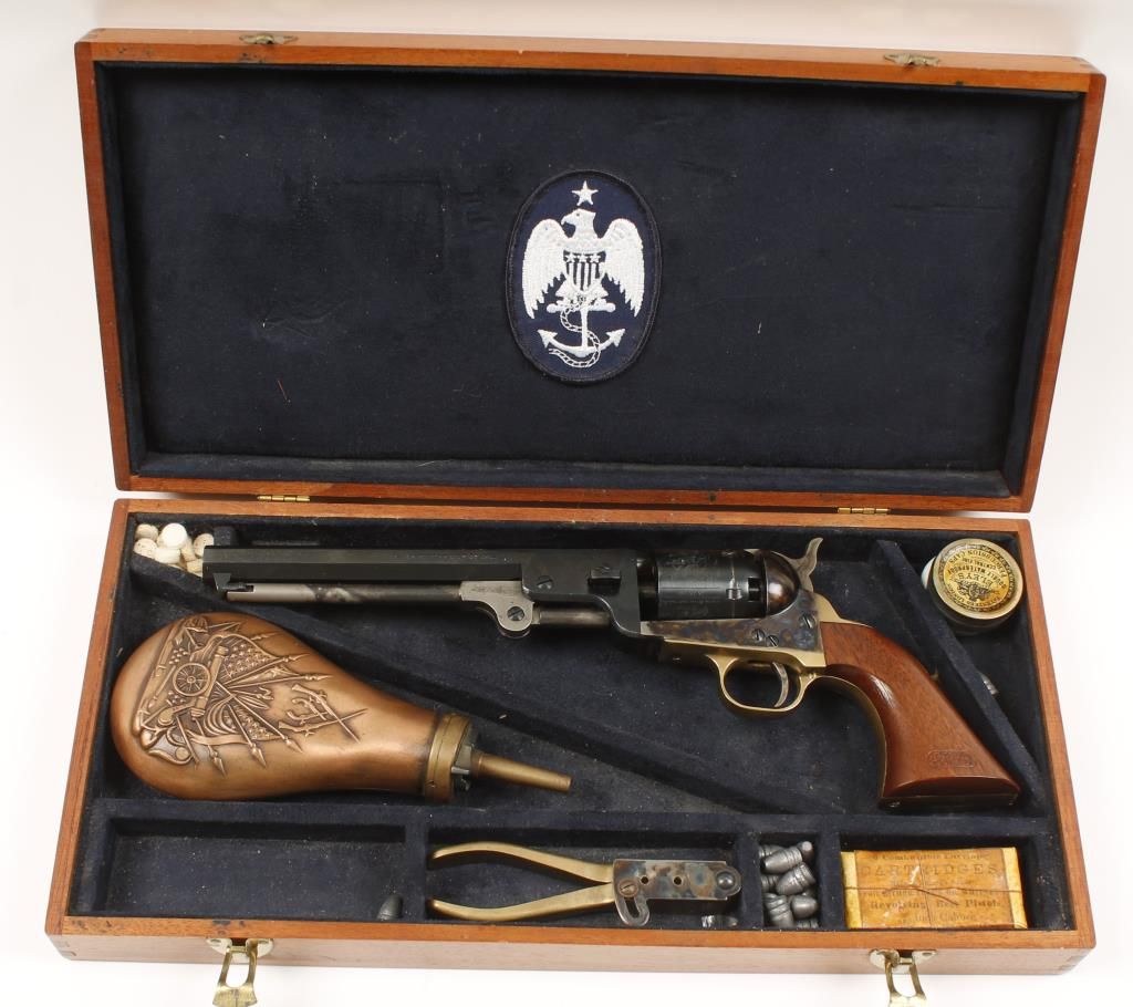 Italian made open top percussion revolver with 7-1/2" octagon barrel. Case colored frame, blued barrel and cylinder with engraving of Naval battle scene, brass trigger guard and backstrap and plain wood grips. Includes cased box with powder flask, bullet mold and more. Condition: Good overall showing small pockets of pitting from improper storage.