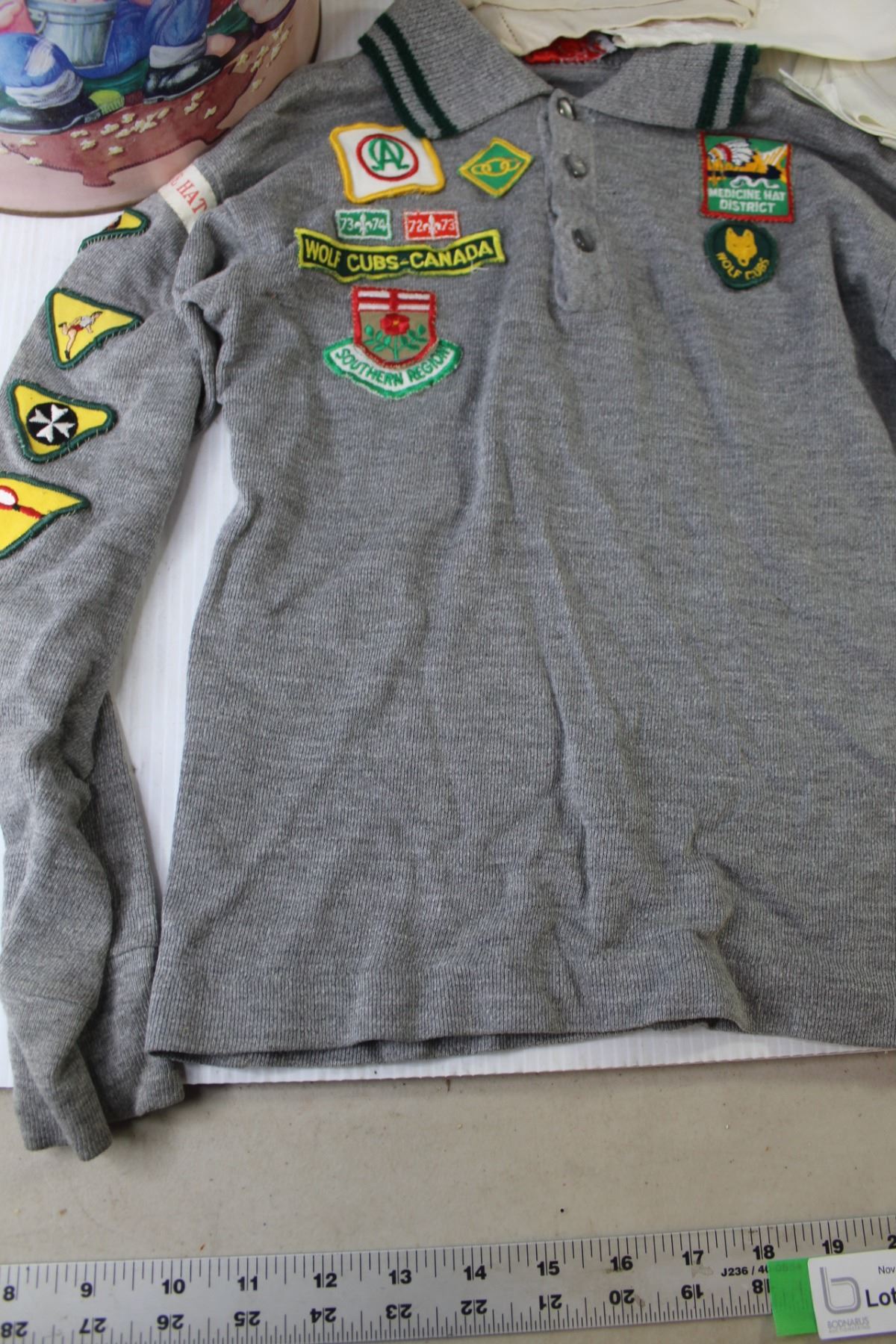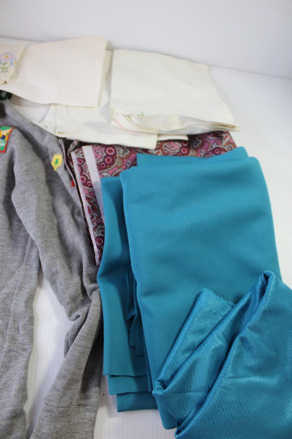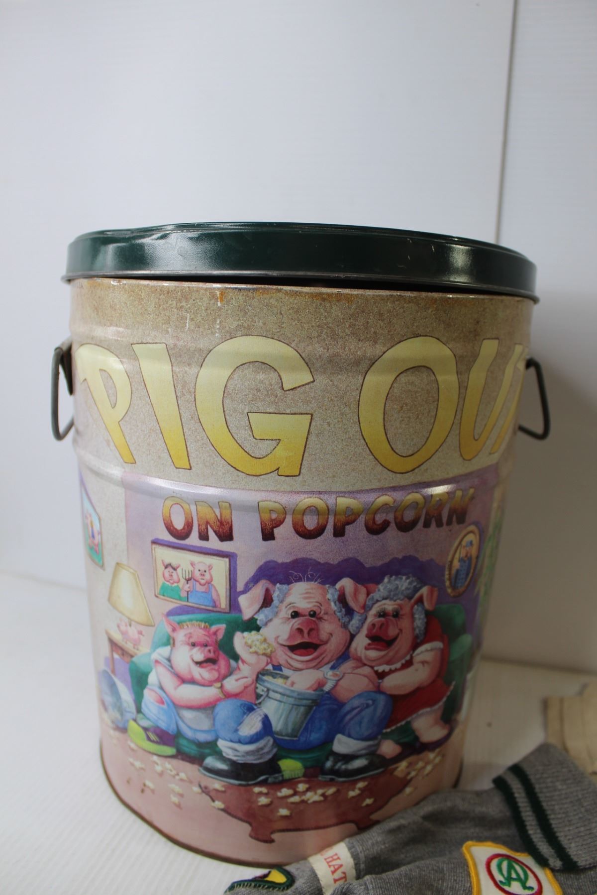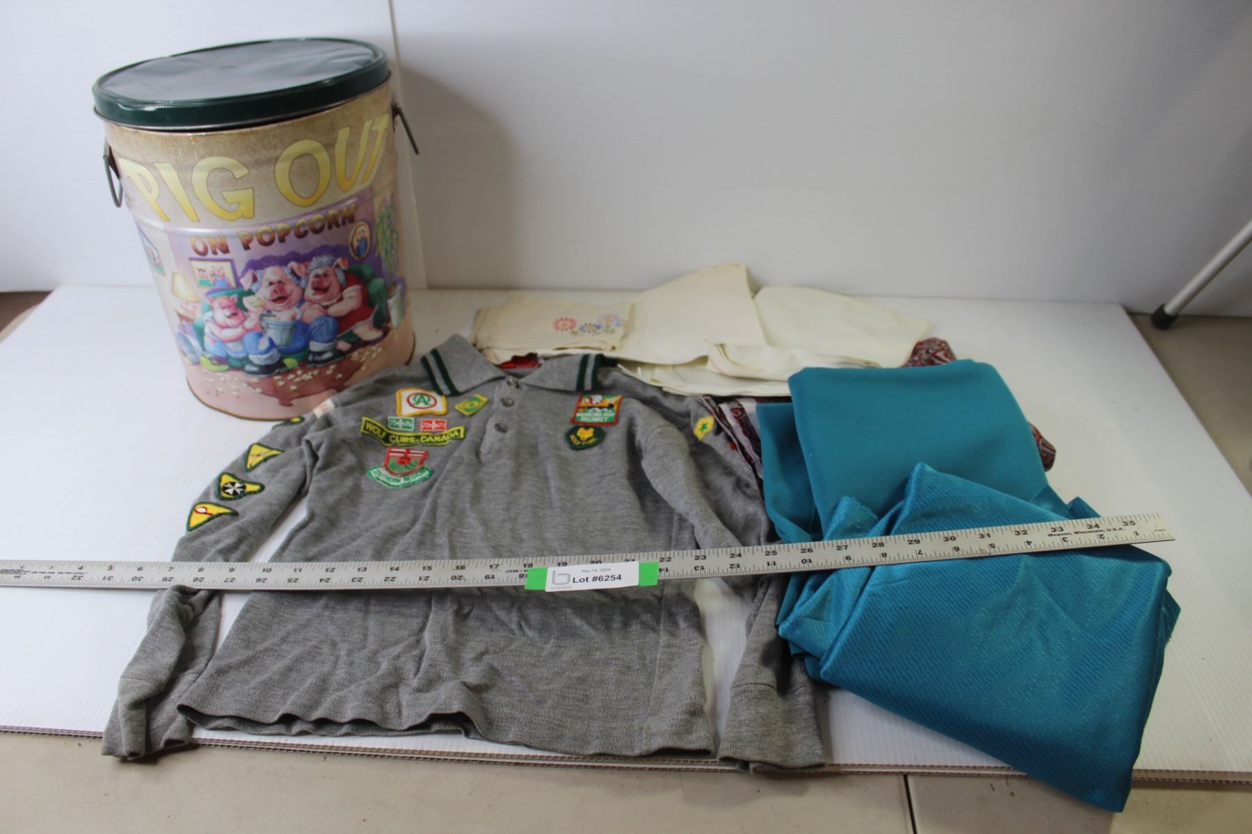 Pig Out on Popcorn Metal Barrel With Lid, Vintage Boy Scouts Shirt, Rolls Assorted Fabric, Tea Towels, Doily)