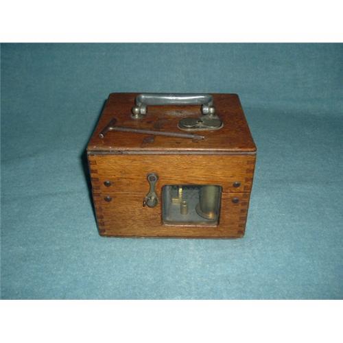 Pigeon racing clock. Unusal old timepiece especially designed to time pigeon races. 14 receptacles. Original key for winding. 6 1/4" x 7 1/4" x 5"H. Some split on wooden box.