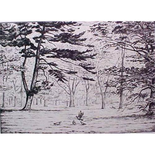 Pigeons on the Mall in Washington, D.C. by Chester Leich. Image 5 inches high x 6 7/8 inches wide.<p>Born in Evansville, Indiana - died 1978 Alexandria Va. He traveled widely in the Southwest, doing a number of paintings and drypoint and other etchings of Southwestern subjects.<p>He studied in Florence, Munich, and Berlin and with Siebelist in Hamburg, Germany.<p>He was a member of the Chicago and Brooklyn societies of etchers.