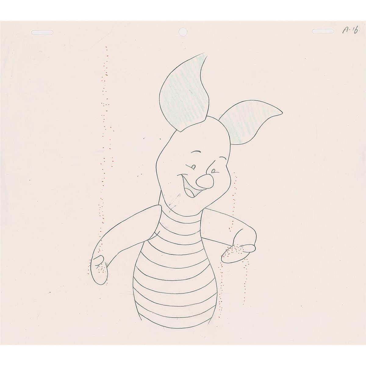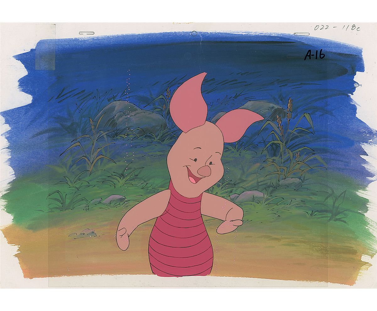 (Walt Disney Studios, 1988) Original production key master cel and background setup with matching production drawing featuring Piglet from Many Adventures of Winnie the Pooh. The cel is placed on a hand-painted production background. Image measures 5 x 7.75, with background dimensions of 14 x 10. In fine condition. A wonderful set of matching production materials with a large character image of Winnie the Pooh’s best friend.