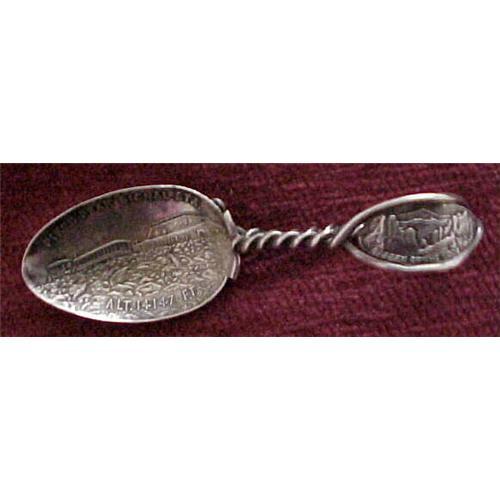 I recently gave a talk on souvenir spoons to a group in New Orleans. Several people asked me if I had ever seen a souvenir baby spoon. Of course, I had seen birth record spoons but never a real souvenir baby spoon...until now. This 3.5" long spoon is a rare find! It is a twist bent handle souvenir spoon of Pike's Peak. The handle has a cartouche with a scene from the Garden of the Gods. The bowl has a great embossed scene from Pike's Peak. There is no indication of maker or silver content, so we assume it is plate. This spoon is in extremely good condition but does have some shallow dings on the back of the bowl. Shipping to US addresses is $4.