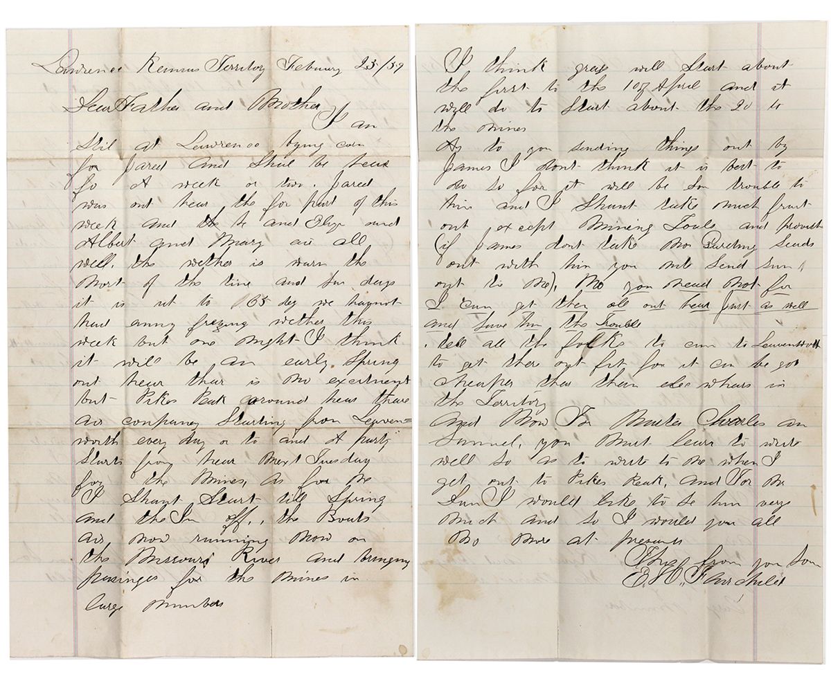 1859 This letter written by E.H. Fairchild home to his father and mother from Lawrence, Kansas Territory, Feb. 25, 1859. "I think it will be an early spring out here, there is no excitement but Pikes Peak around here. There are companies starting from Leavenworth every day or two and a party starts from here next Tuesday for the mines. As for me, I shant start till spring and then I'm off. The boats are running now on the Missouri river and bringing provisions for the mines in large numbers. I think grass will start about the first to the 10th of April and it will do to start about the 20th to the mines." With further discussion of sending mining tools. Much of the letter has mispelled words. It measures 12.5" x 7.95." Generally excellent, no cover. Fairchild is not mentioned as a Colorado Pioneer in Hall. Not listed in the 1859 Colorado Busienss Directory. Not listed in Colorado Biography. Lynn Langdon Collection - HKA#65543