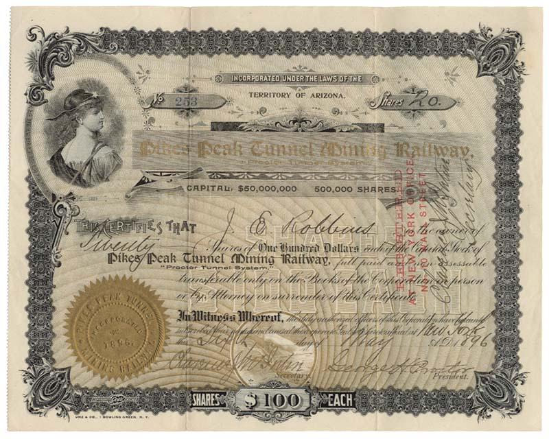 1896, Colorado. Stock certificate for 20 shares. Gold/Black. Vignette of Liberty head at upper left. Litho. Signed as president of the company by George H. Proctor. Procter’s plan was the creation of a tunnel through the mountain from Manitou to Cripple Creek. A Fine and scarce Colorado Railway stock. Uncancelled and Very Fine.