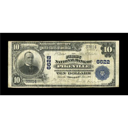 <B>Pikeville, KY</B></I> - $10 1902 Plain Back Fr. 624 <B>The First NB</B></I> Ch. # 6622<BR>The paper is perfectly original and the signatures of John M. Yost and George W. Green are bold. <B>Fine-Very Fine.</B></I><BR><BR><b>Shipping:</b> Coins & Currency (<a target="_blank" href="http://www.heritageauctions.com/common/shipping.php">view shipping information</a>)