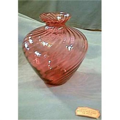 This magnificant vase is from Pilgrim Glass. The wonderful swirl patterned cranberry glass vase measures 9.25" high and aprox 8" wide at it's widest. Pilgrim Glass is world renowned for the quaility and color of it's cranberry glass. It is blown by mouth and shaped by hand. The original hang tag is included. It is marked PILGRIM GLASS, CEREDO, WEST VIRGINIA,U.S.A.