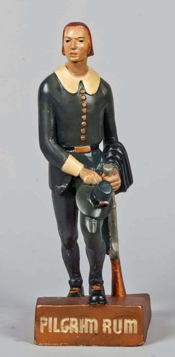 Pilgrim Rum Painted Chalkware Figural Countertop Advertising Store Display Statue, Featuring pilgrim man with hat and rifle, Marked "Pilgrim Rum" on base. Condition (Restored). Size 16-1/2"h.