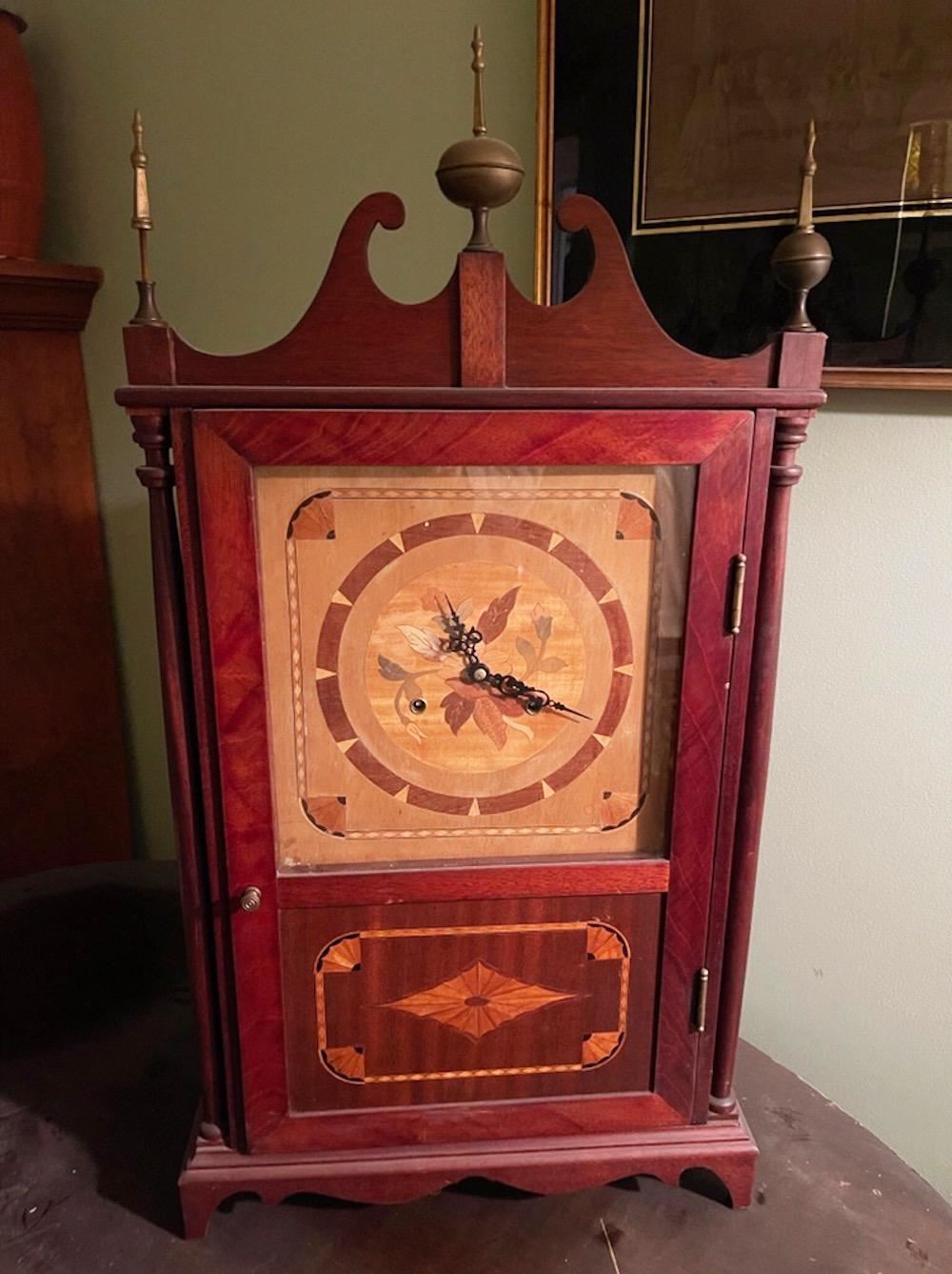 Pillar and scroll clock with marquetry inlay on case and inlay rose design on face, from the lifetime collection