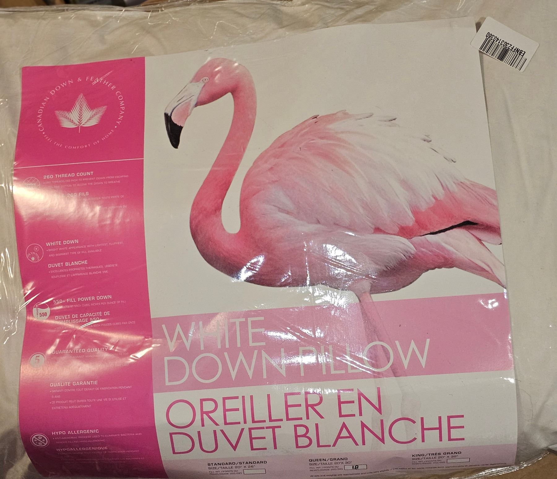 Canadain Down White Down Pillow Queen Size, 260 Thread Count, 550+ Fill, Shelf Pull, New Condition
