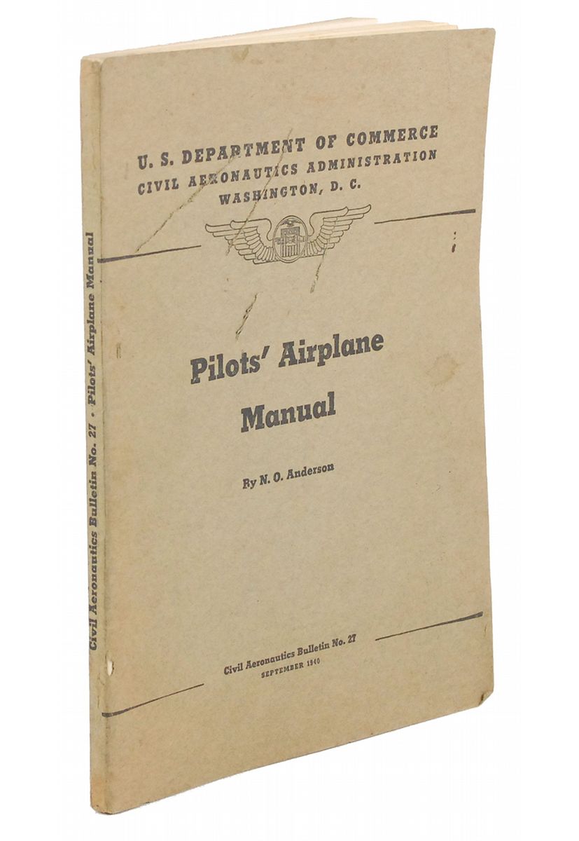 Pilot’s Airplane Manual by N. O. Anderson, 6.5 x 9, 150 pages, September 1940, issued by the US Department of Commerce and the Civil Aeronautics Administration. Chapters include “Stresses on Aircraft Structures,” “Airplane Materials,” “Airplane Construction,” and “Assembly and Alignment.” In very good condition, with expected handling wear and several diagonal cuts to cover.