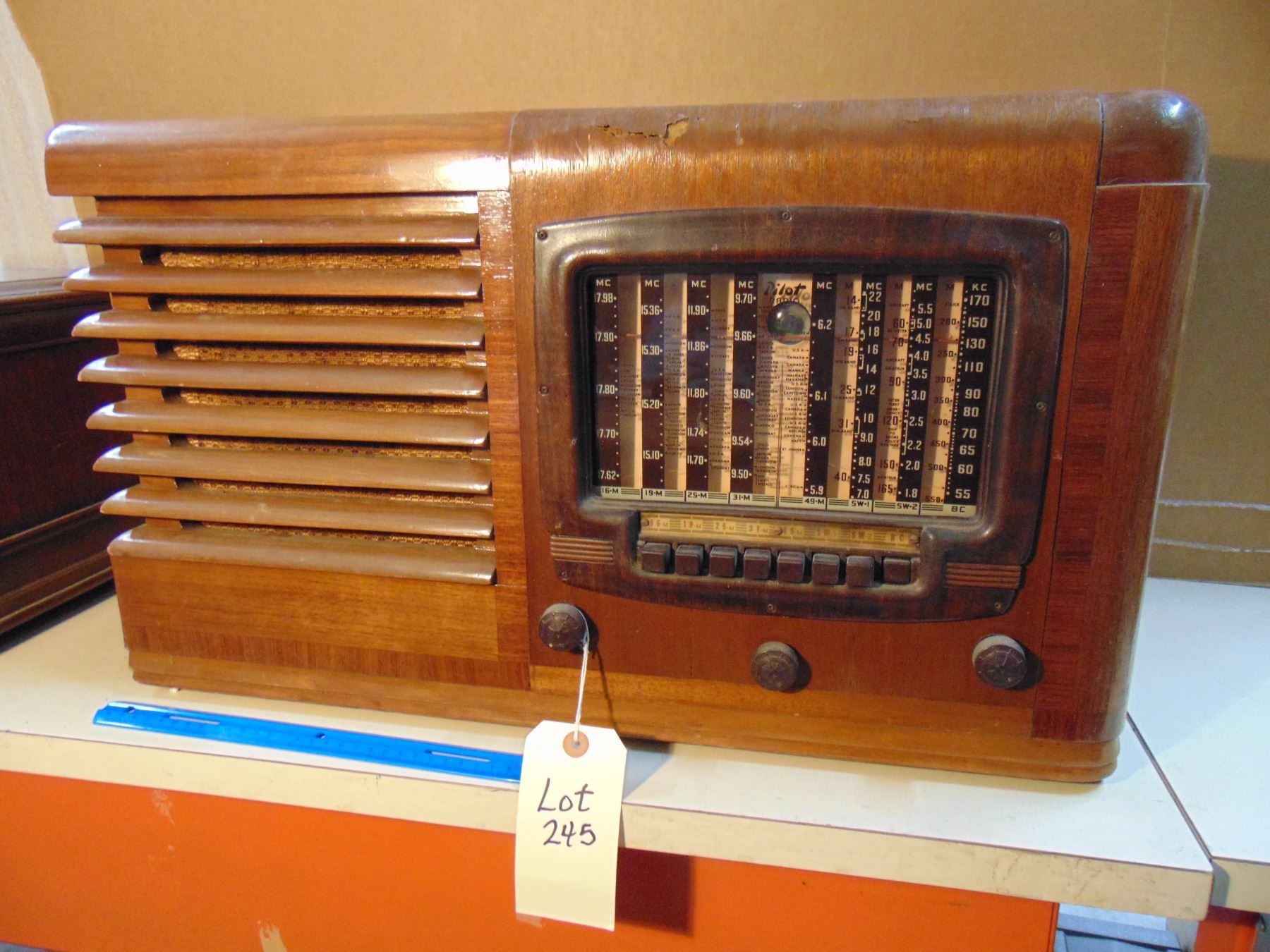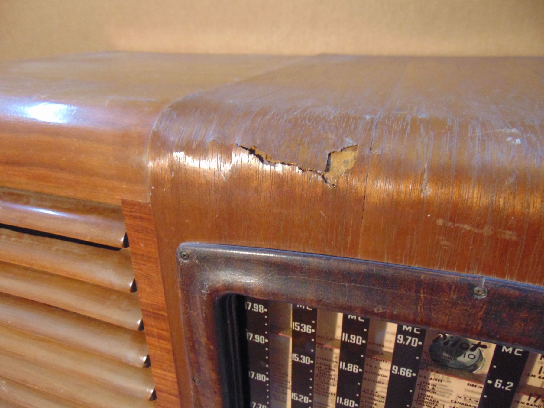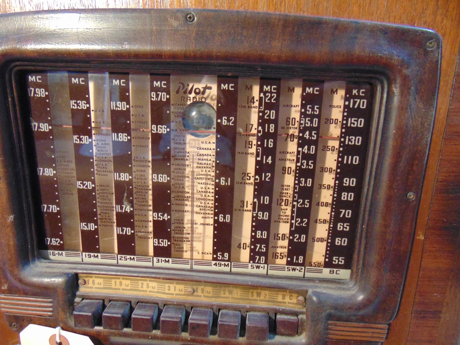 Pilot large 11 tube plus two ballast tubes wood table top; multi-band shortwave and broadcast. Veneer waterfall on top front will need to be repaired. Includes three pilot wheel knobs and tuning eye.