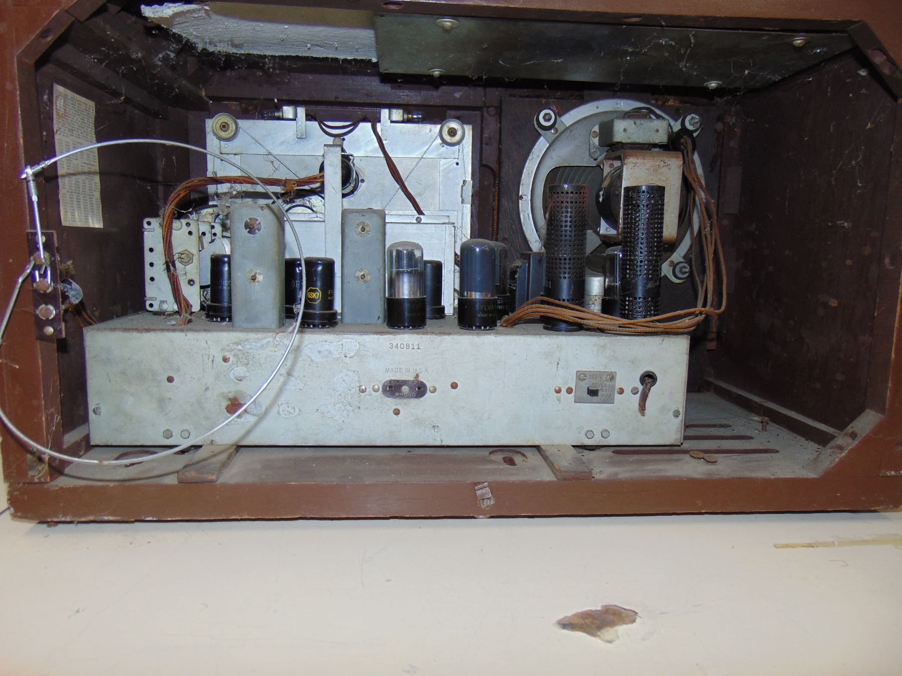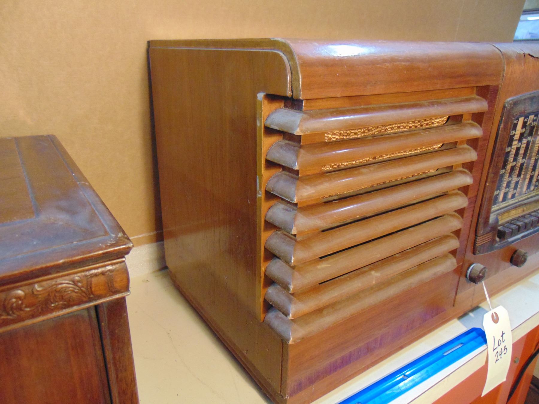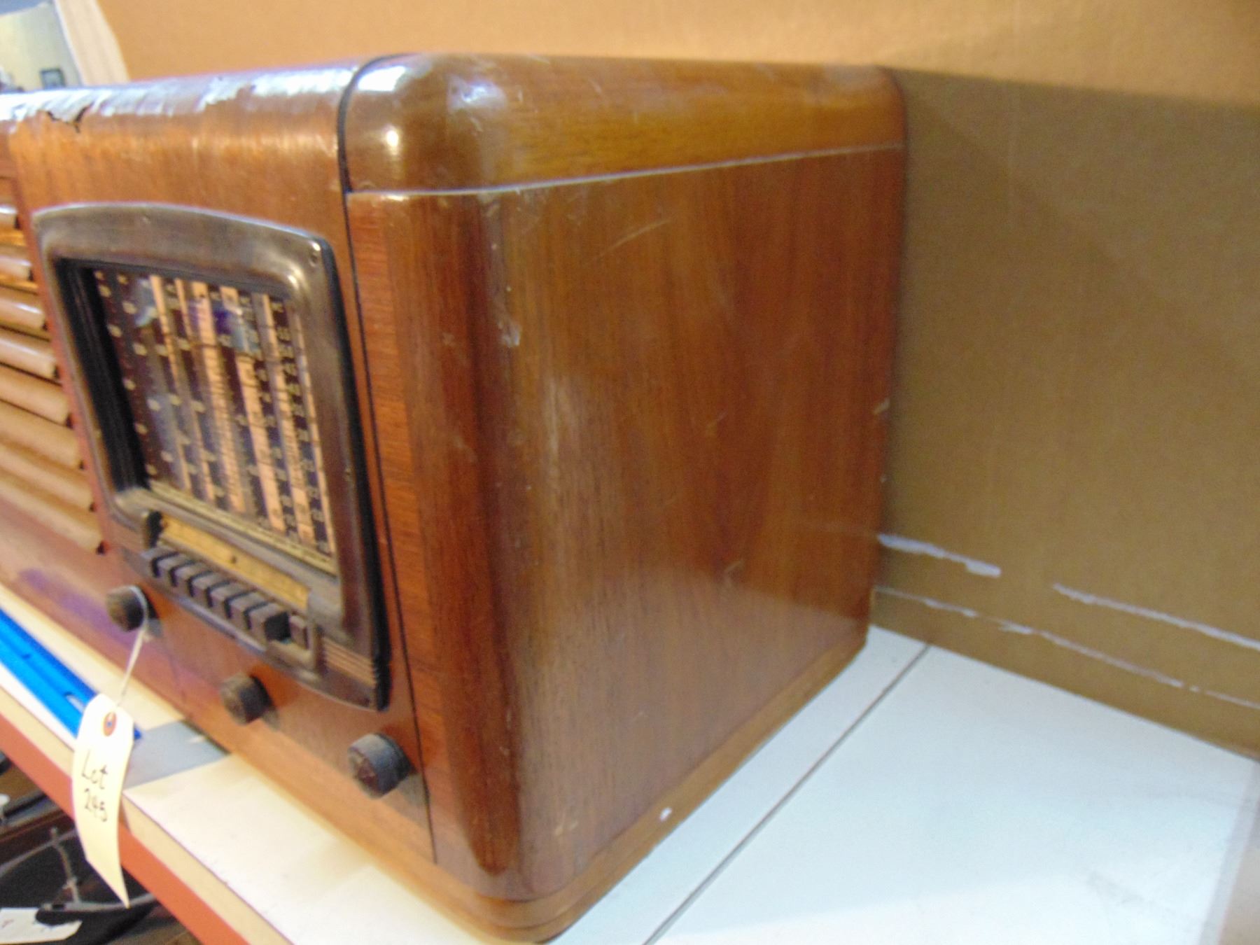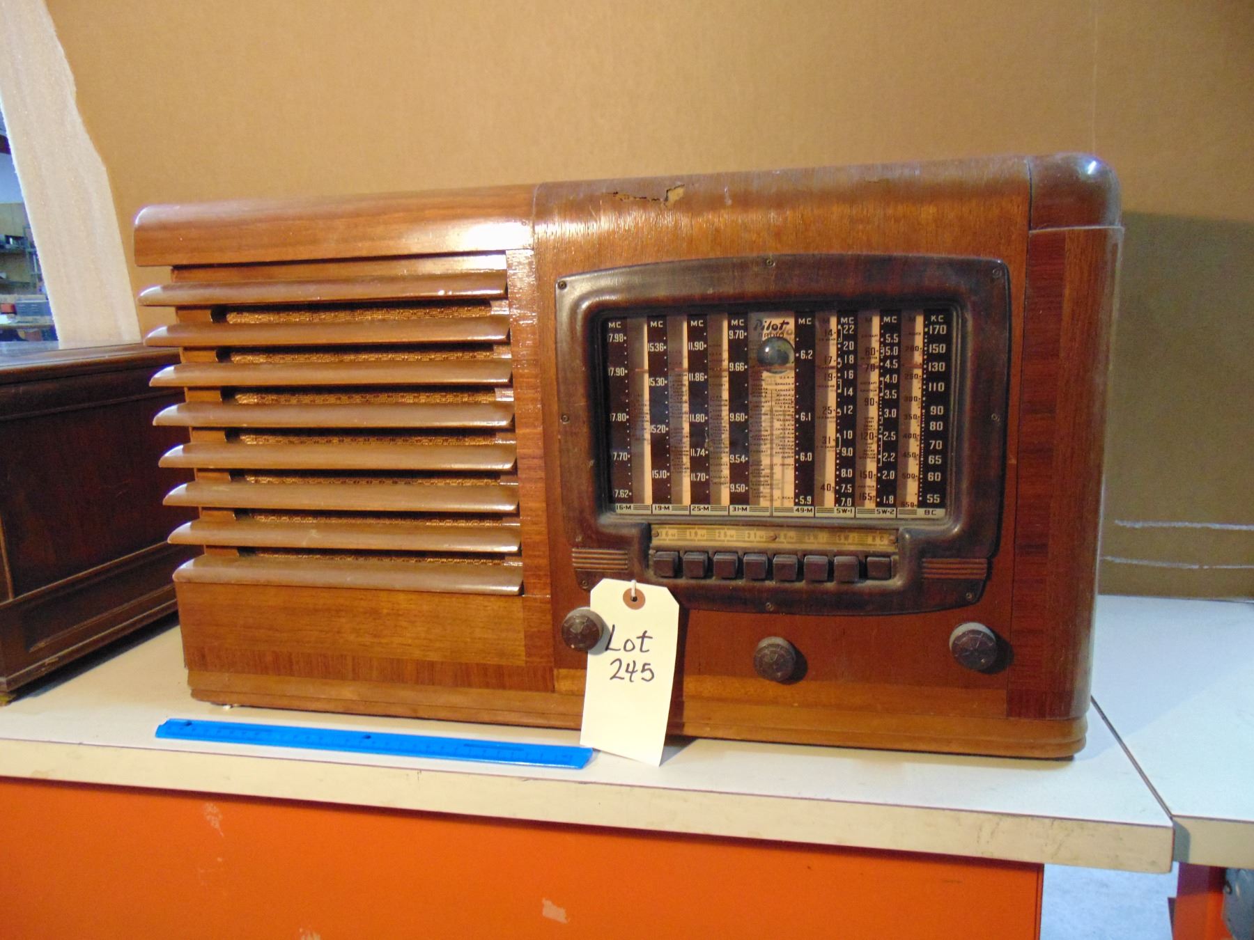 Pilot large 11 tube plus two ballast tubes wood table top; multi-band shortwave and broadcast. Veneer waterfall on top front will need to be repaired. Includes three pilot wheel knobs and tuning eye.