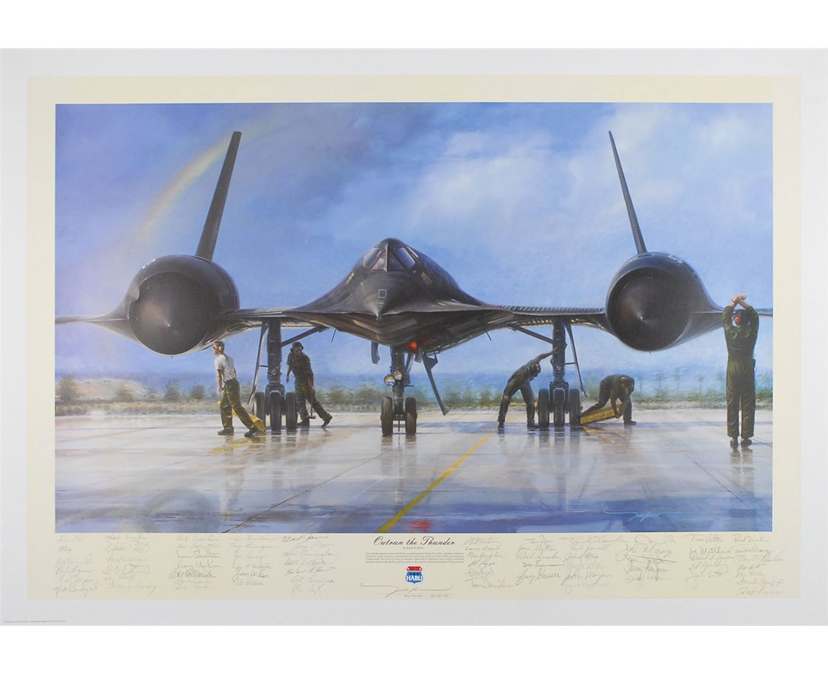 Color limited edition 37 x 26 print entitled ‘Outrun the Thunder,’ showing an SR-71 being prepped for a flight over Russia, numbered AP47/75, signed in pencil by 66 pilots and crew members. Signers include: Ed Payne, Phil Loignon, Ray Haupt, Pat Halloran, Maurey Rosenberg, Bill Burke, Barry MacKean, Jim Shelton, Tony Bevaqua, Pat Bledoe, Jr., Harlon Hain, Gil Martinez, Larry Boggess, Jerry Glasser, Bob Powell, Rick Graham, John Storrie, John Morgan, Chuck Sober, Tom Veltri, Ed Yielding, John Veth, Ted Ross, and Rom McCleary. Also signed in pencil by the artist, John D. Shaw. In fine condition.
