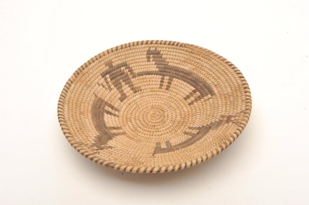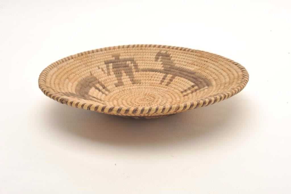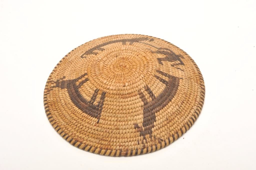 Pima (Arizona) Indian basket circa early 1900's with figurals of stags, horses and hunter with bow. 11" across. Near fine condition. No damage. Est. $600-$1,200.
