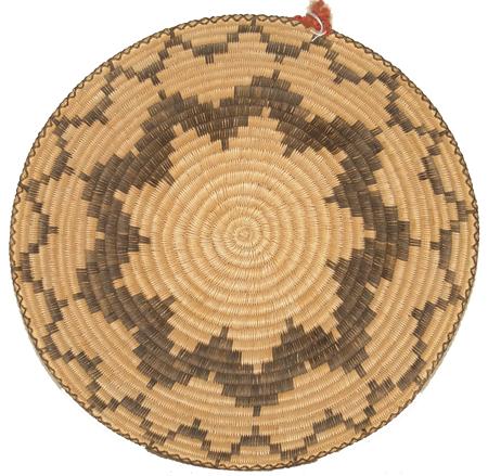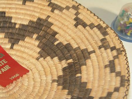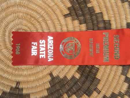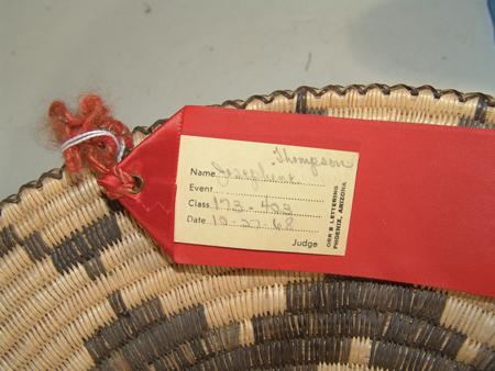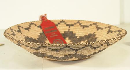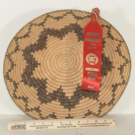 Great coiled tray with devil's claw stepped motif in center and encircling rim. With 2nd Place ribbon. By Josephine Thompson. 3" x 13-1/2"