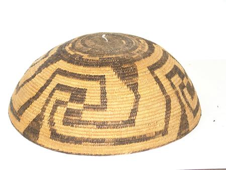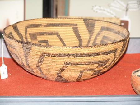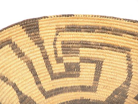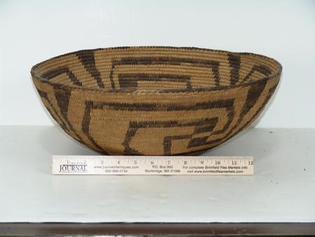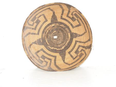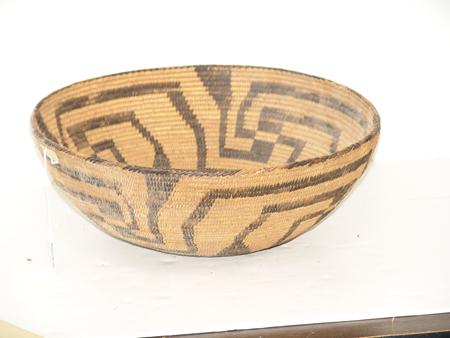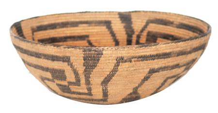 Circa Mid 1900s, Large woven basketry bowl with traditional modified key design and black center. Very good condition, some fading. 6" x 16" From the Millican Collection.