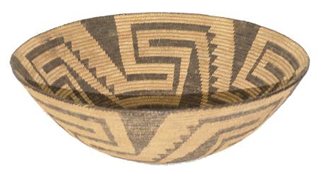 Circa 1940s, Classic large wide basketry tray/bowl with black center and traditional modified key design. Very good condition. 5-1/2" x 16-1/2"