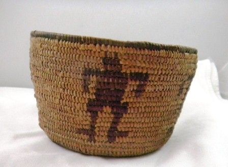 Pima Basket from 1920's with five human figures. Measures 6 inches by 4 inches. Condition is good. Shipping $18.00. Item made from willow and devils claw