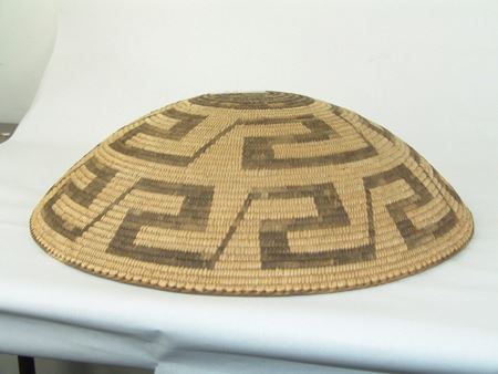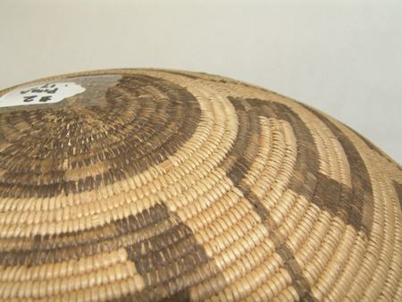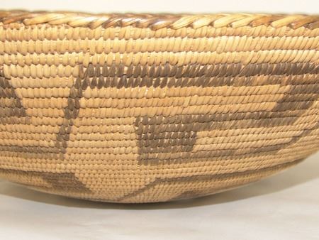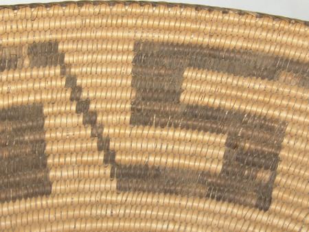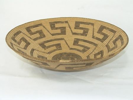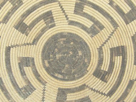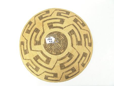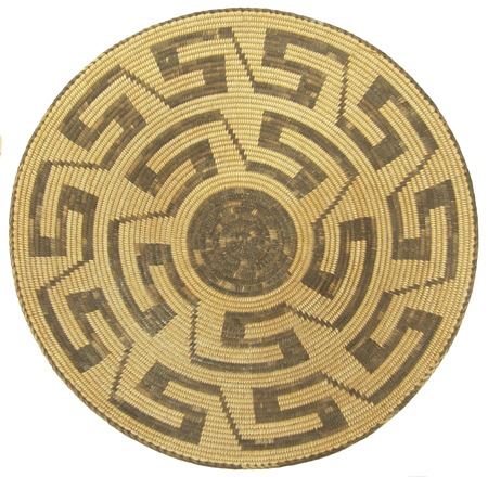 Ca. 1940s, Beautiful flared basketry tray with traditional geometric/optical design around the black center. Very good condition. 4-1/2 x 17-1/2" dia