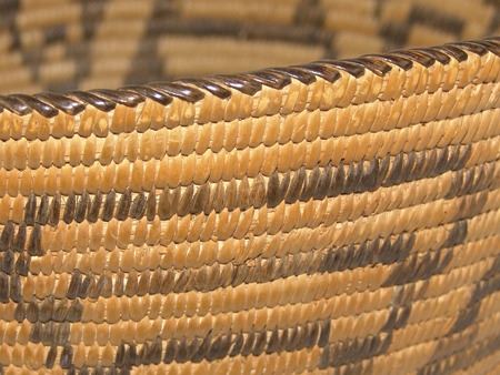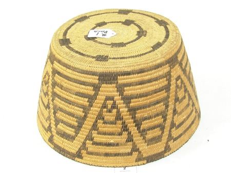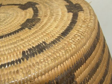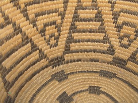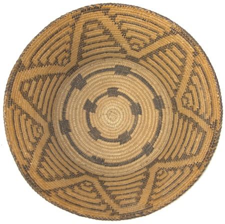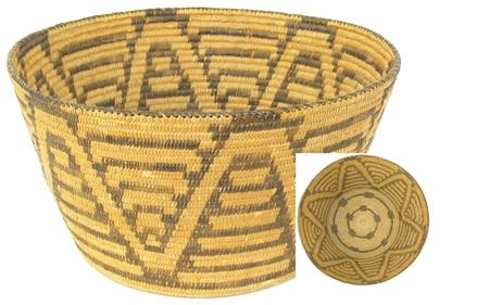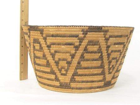 Ca. 1940s, Classic vintage deep basketry bowl with slightly flared sides and intricate geometric design. Very good condition. 6-1/2" x 12" dia.