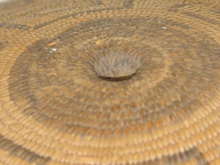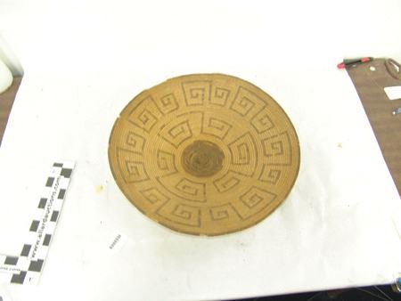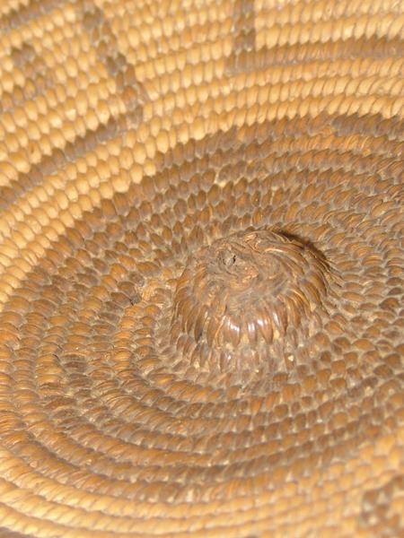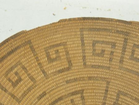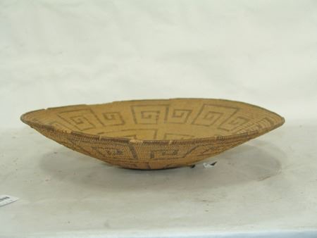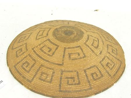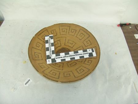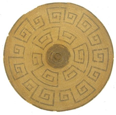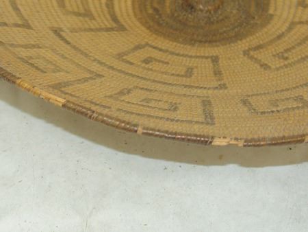 Early 1900s, Classic finer weave basketry tray with double row of key designs and rare raised center knob within the black start. Good condition, missing rim sections in several areas. 3-1/2" x 16"