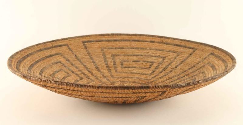 Circa 1890 large shallow bowl basket with a center bow design. Measures 18"x3 1/2". Good condition.