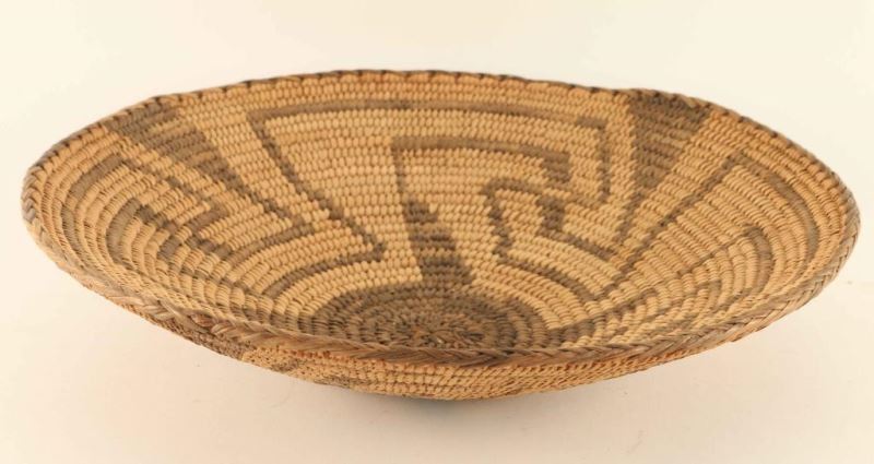 Shallow bowl basket with fret design. Measures 11"x2 1/4". Good condition 1920s era.